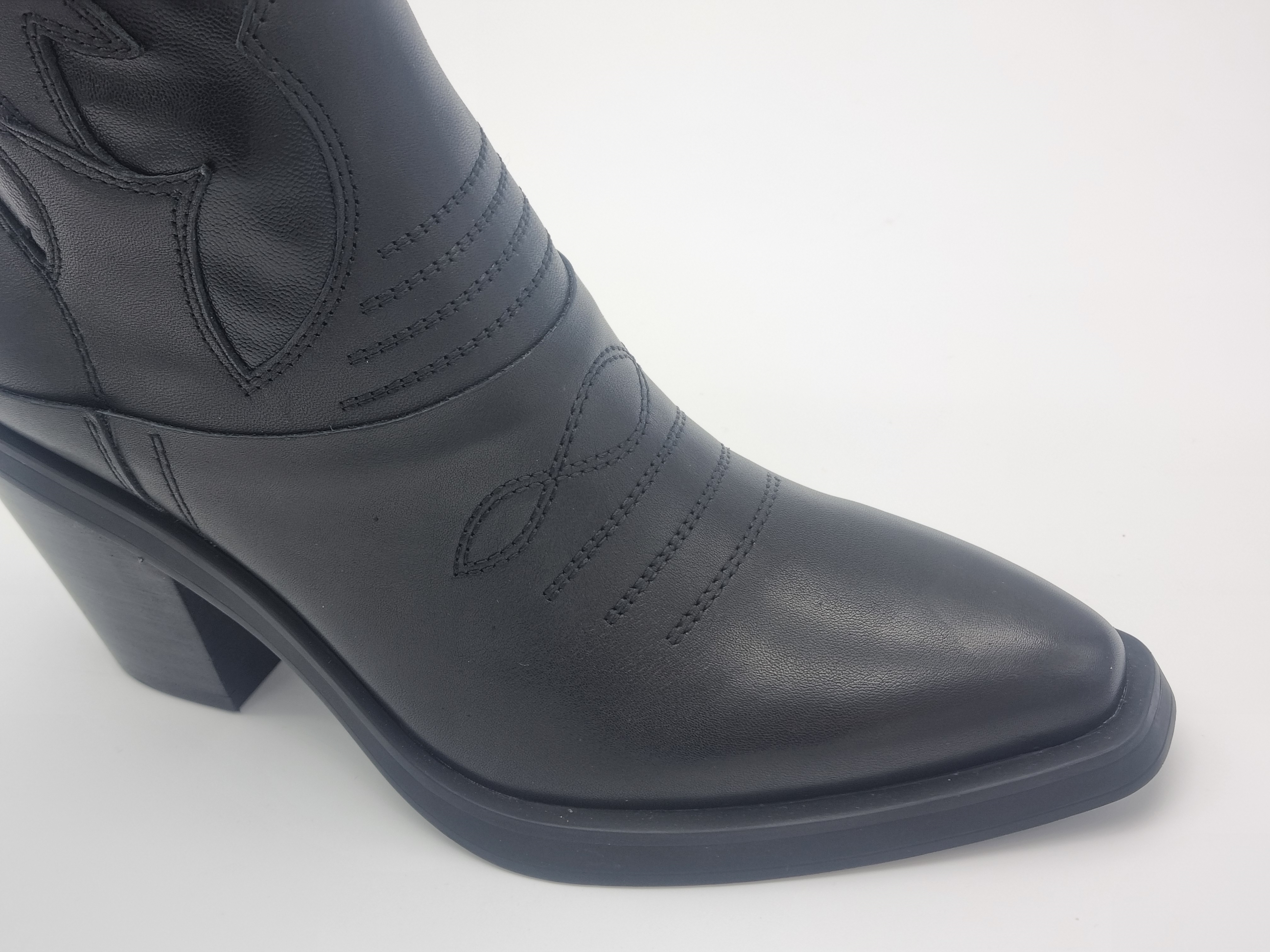 Elegante botín estilo cowboy. Combina piel y ecopiel en caña para mayor adaptabilidad. Detalles de pespuntes. Cierre con cremallera. Plantilla y forro de la horma de piel. Suela de goma. Altura 8.5 cm