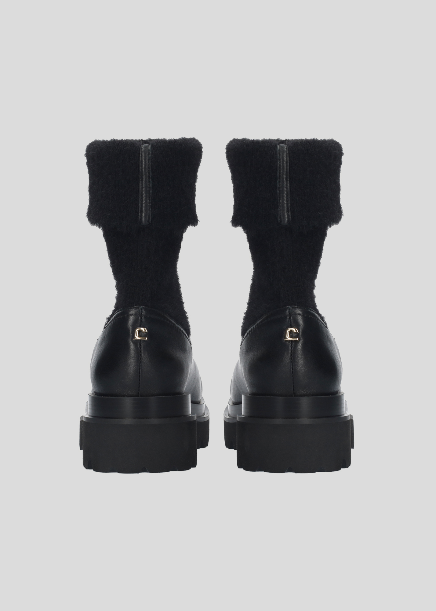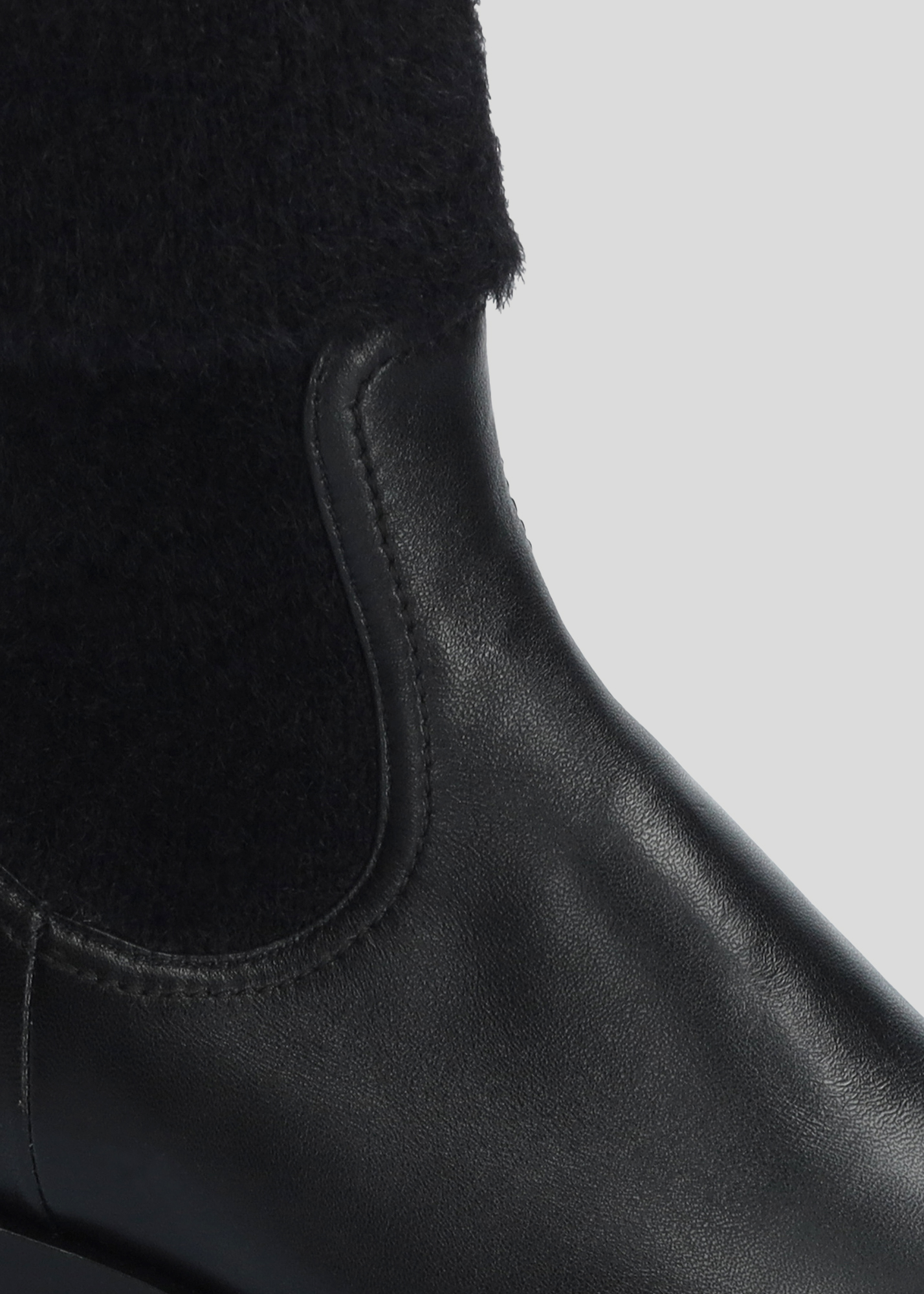 Confortable botín estilo chelsea que combina mohair y piel 100 %. Plantilla y forro de napa 100 % piel. Plataforma de 3' 5 cm. Suela track de goma.