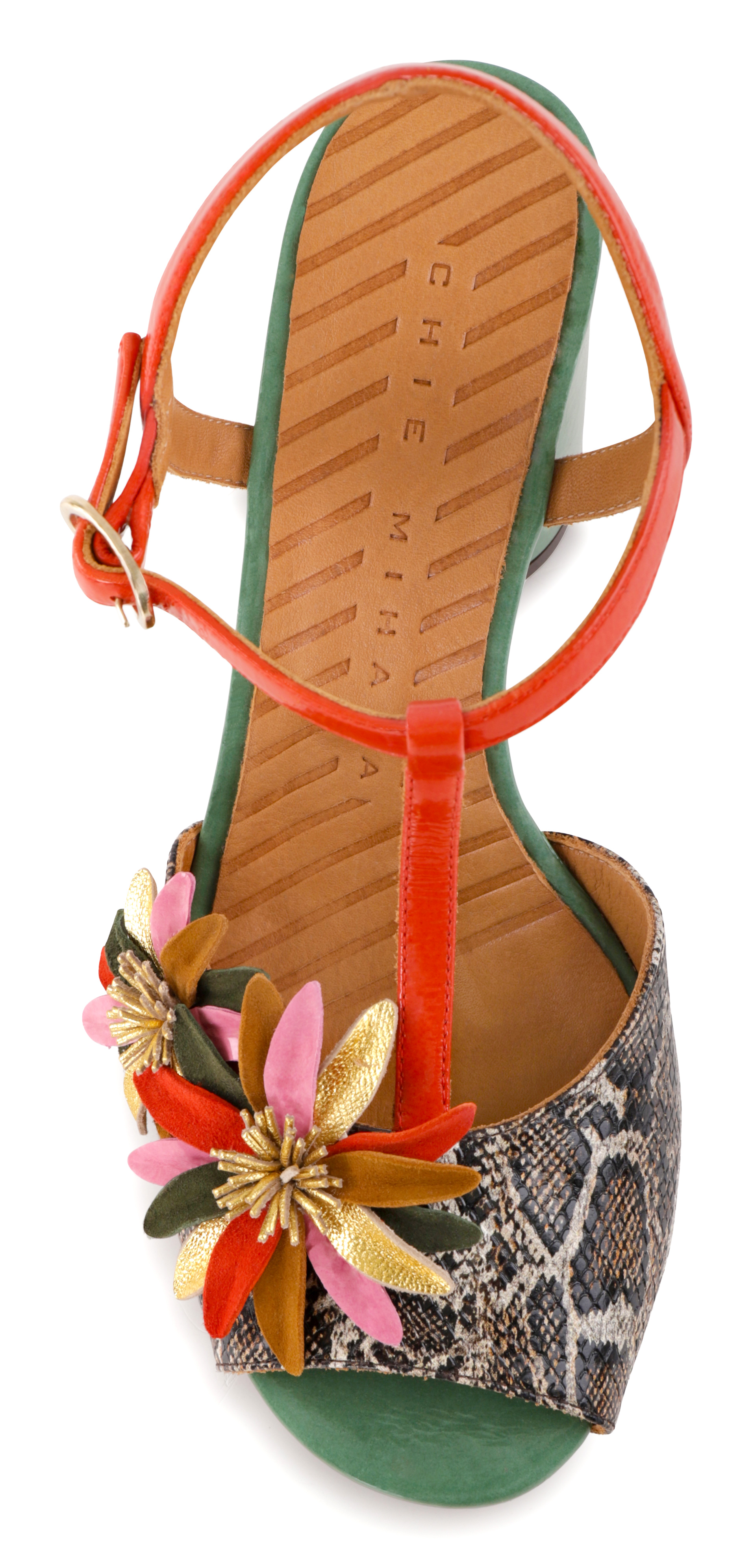 Sofisticada sandalia que combina piel 100% de charol y estampado animal. Elegantes flores artesanales nos transportan a los 20s. Forro, plantilla y suella de piel. Tacón de 9 cm.