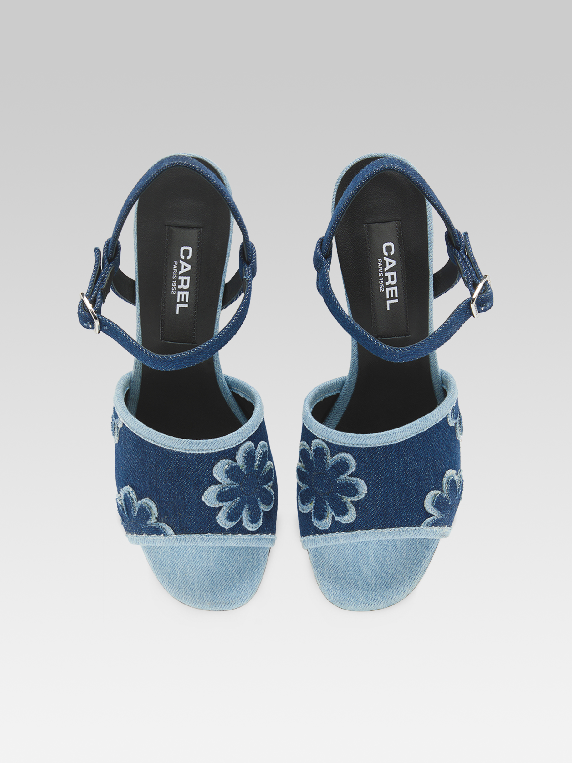 Sandalia estilo 80s realizada a mano de manera artesanal. Combina tejido vaquero y piel 100 % natural. Cerrada en tobillo mediante hebilla. Forro y plantilla de piel. Tacón de 7 cm. Suela de cuero.