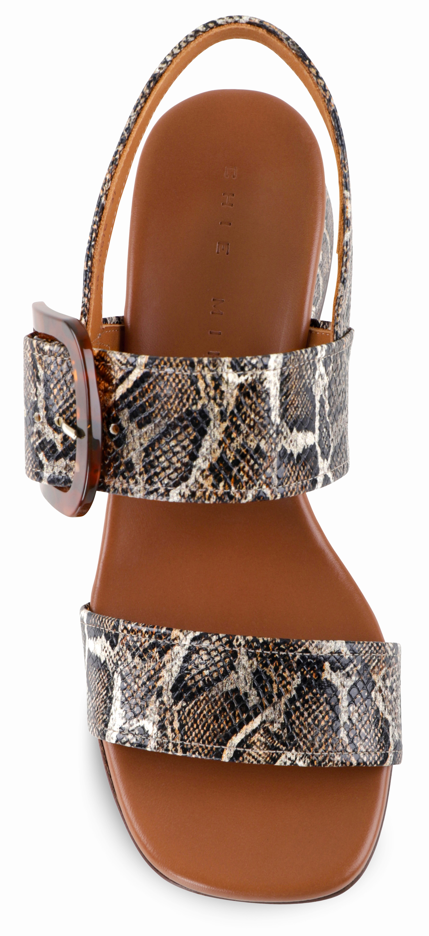 Elegante sandalia 100% piel estampado animal. Cierre en empeine con maxi hebilla a contraste. Forro y plantilla de piel. Suela de cuero. Hecha a mano. Tacón cuadrado de 5 cm.