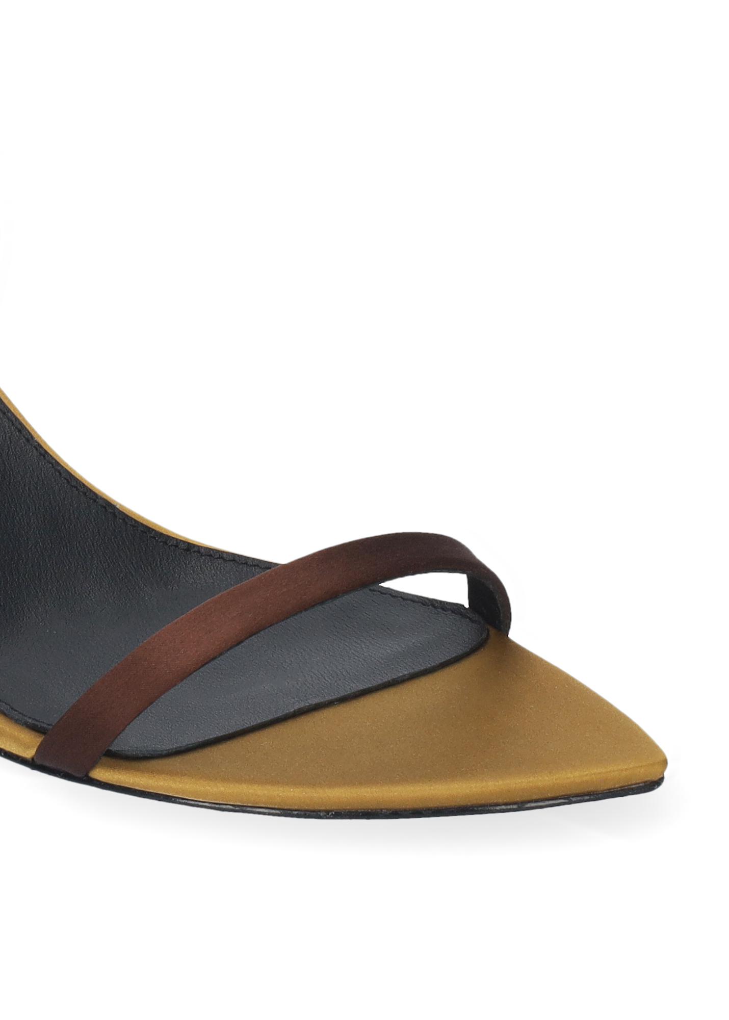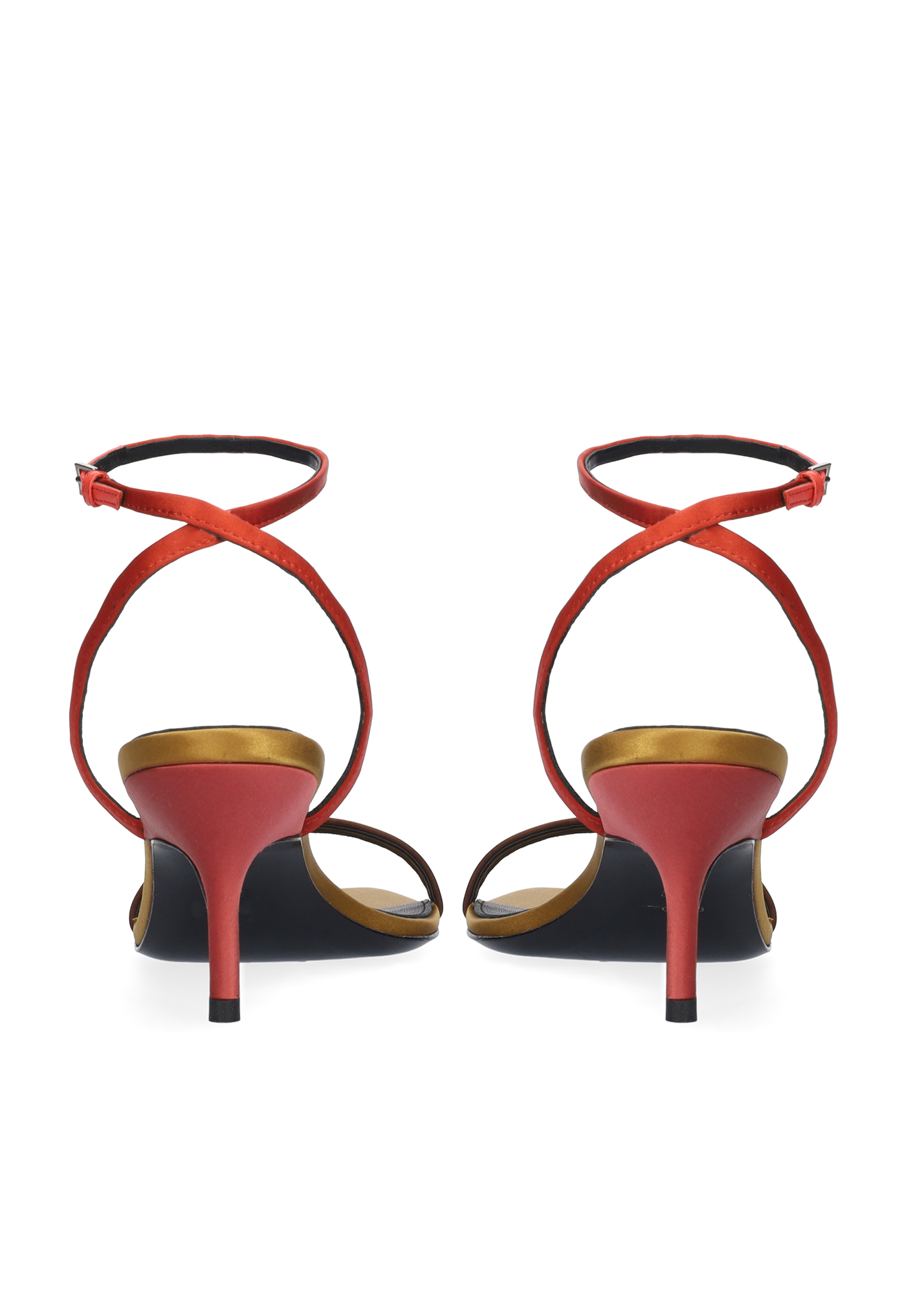 Elegante sandalia de fiesta de raso. Estilo avant-garde. Cerrada en tobillo mediante hebilla. Forro y plantilla de piel. Suela de cuero. Tacón forrado de 8 cm