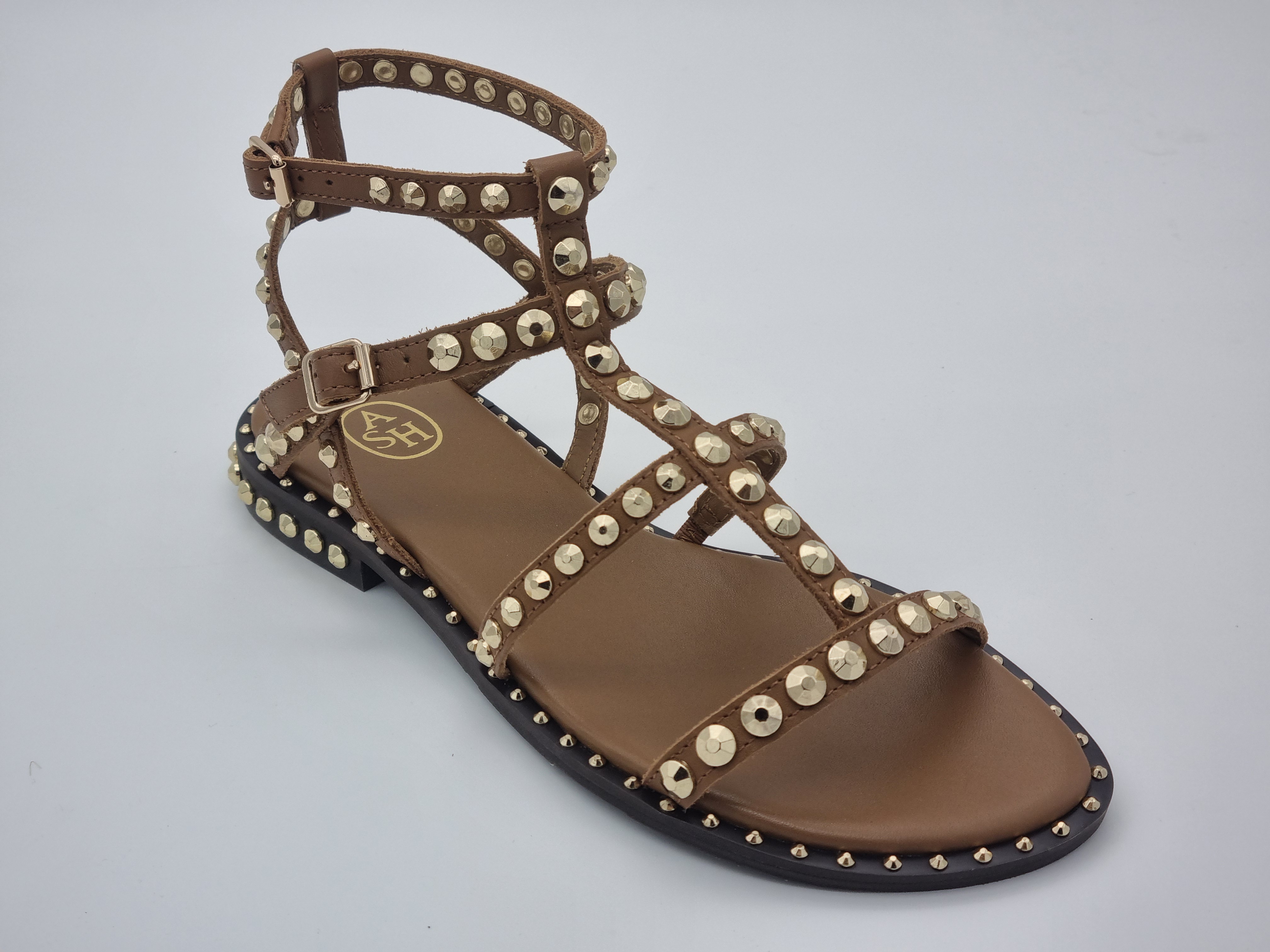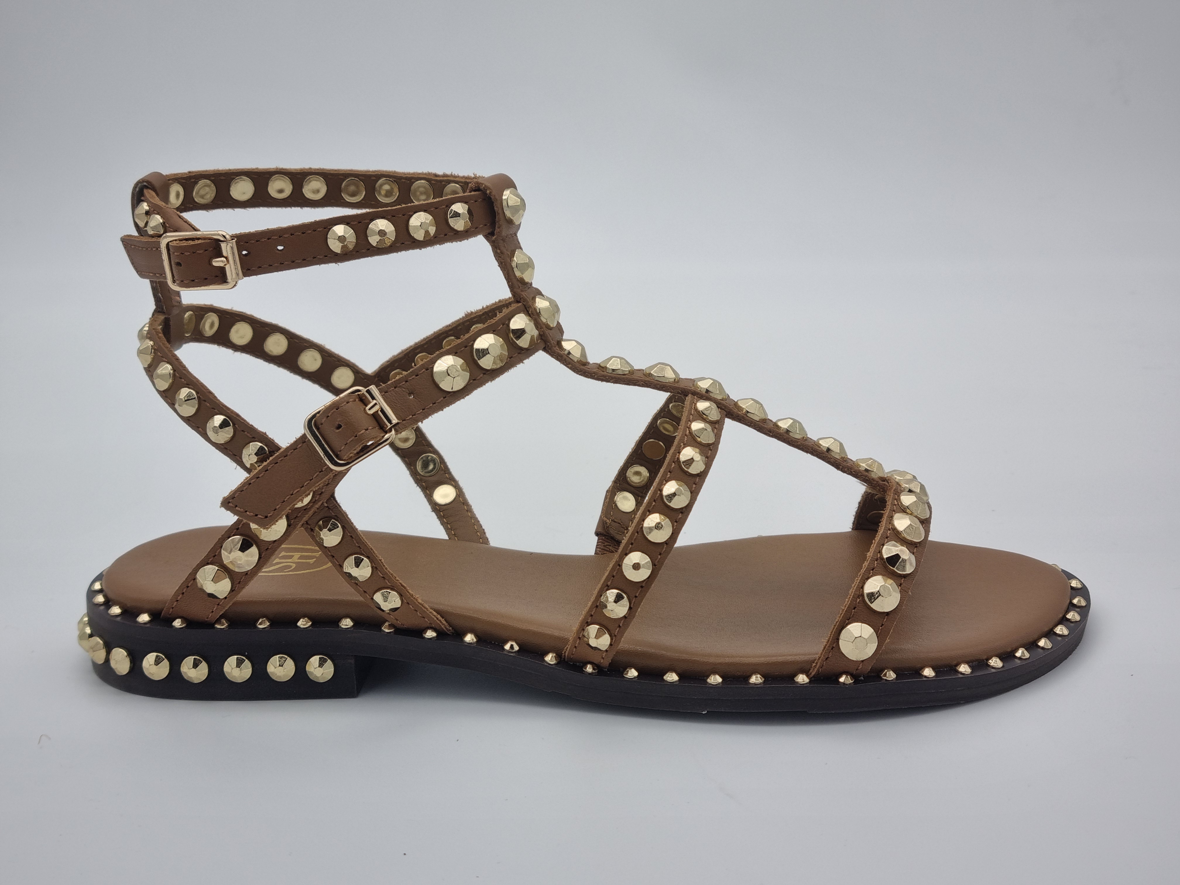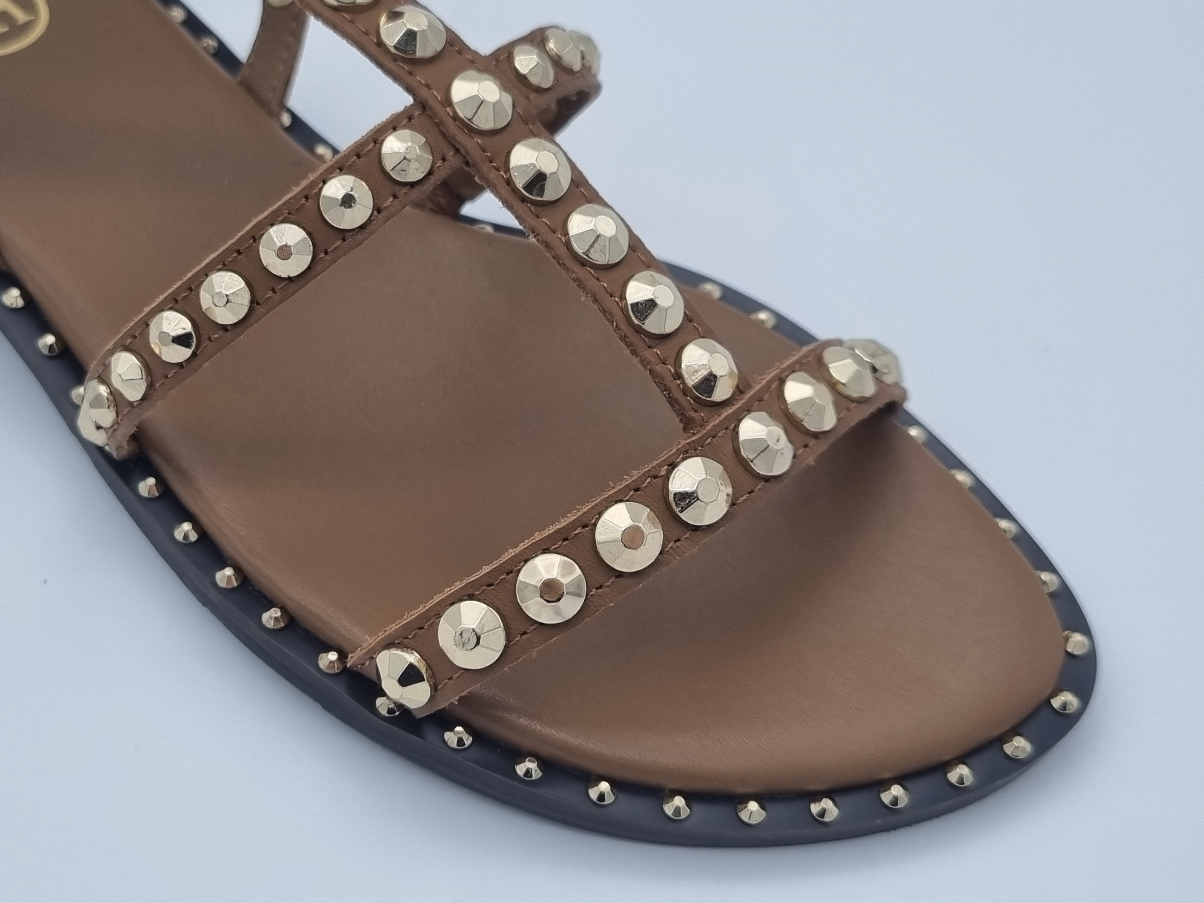 Sandalia plana estilo romana 100 % piel. Adornada con múltiples tachuelas que le confieren un look punk chic muy en tendencia. Cierre mediante dos hebillas. Forro y plantilla de piel. Suela de goma.
