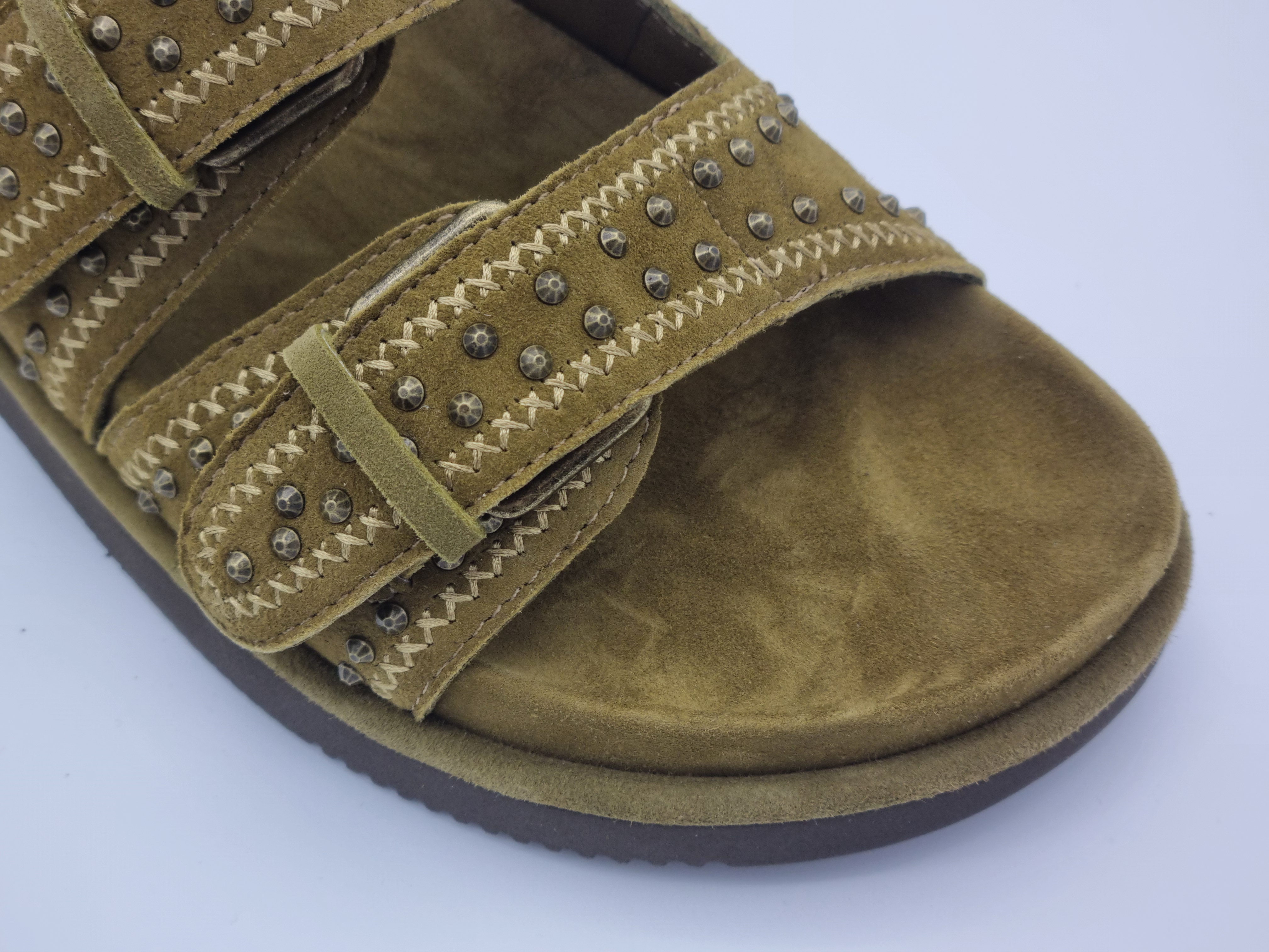 Comodísima sandalia bio de ante 100 % piel ovina. Estilo zueco cerrada mediante dos hebillas escondidas debajo de la doble tira. Plantilla y forro de piel. Suela de goma.