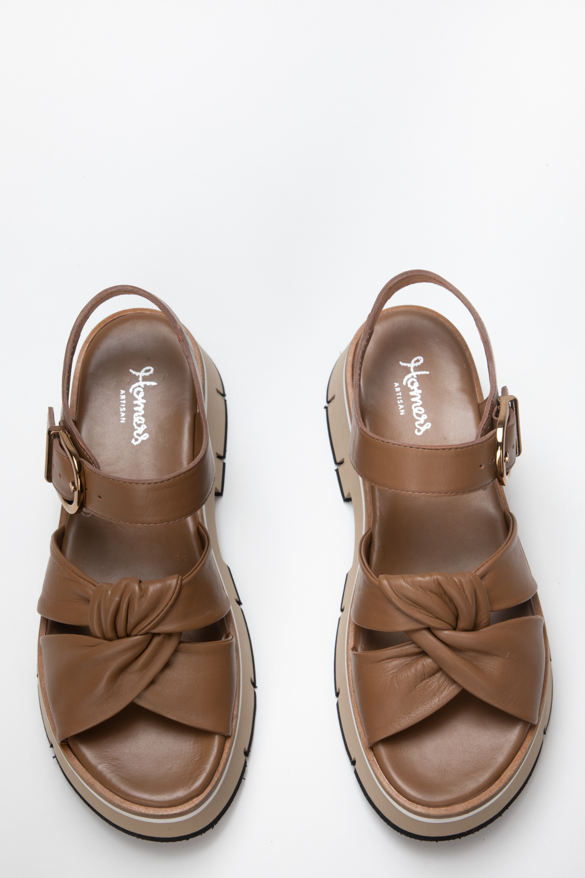Sandalia minimalista, con dos tiras anudadas entre si, de napa 100 % piel de cordero. Cierre mediante hebilla. Forro y plantilla acolchada de piel. Plataforma y suela de goma. Altura 5 cm.