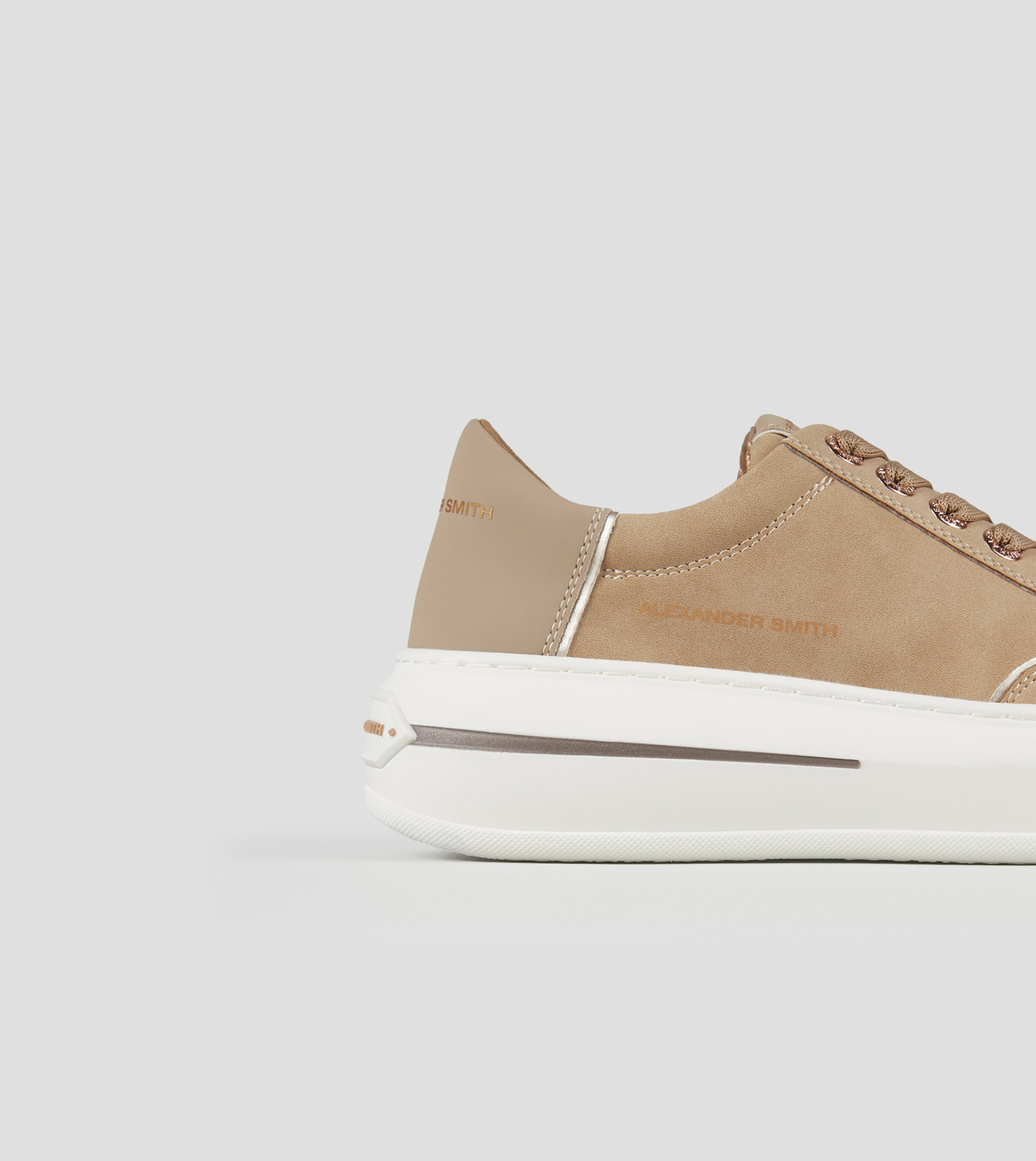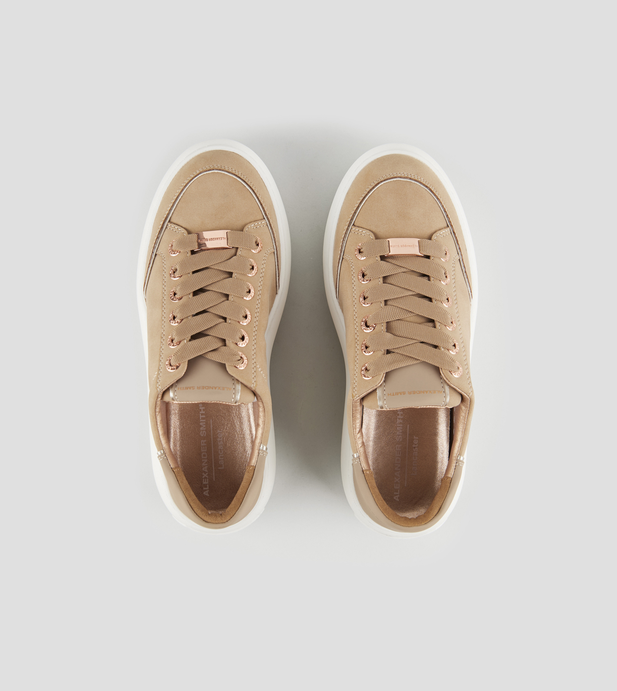 Elegante zapatilla urbana de ecopiel con detales metálicos. Plantilla 100 % piel. Forro téxtil. Plataforma de 5 cm. Suela de goma.
