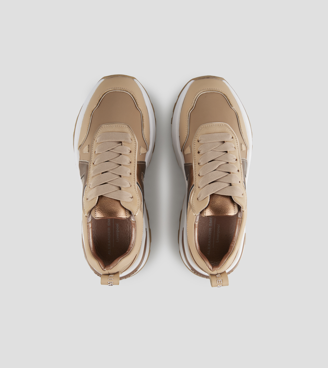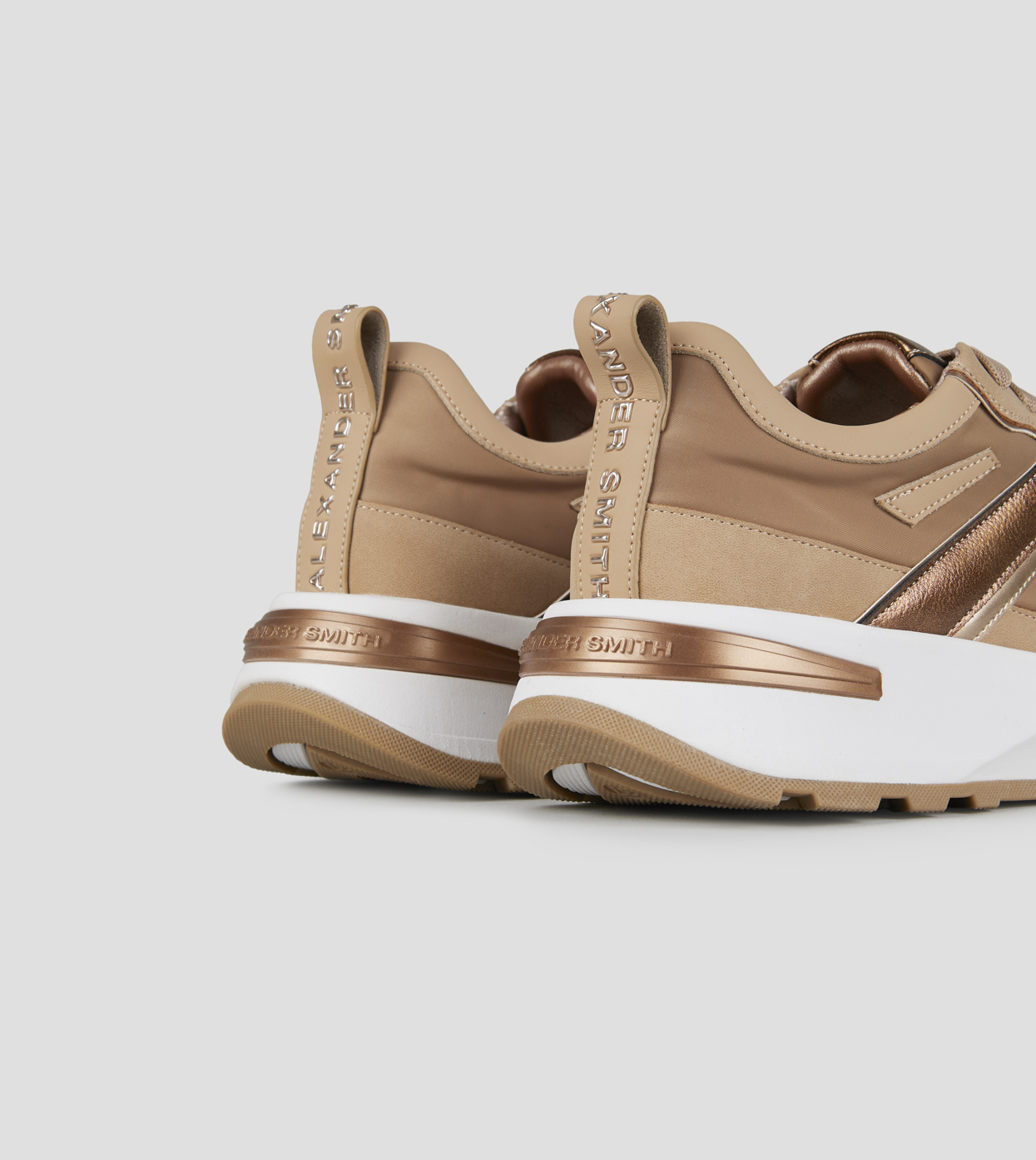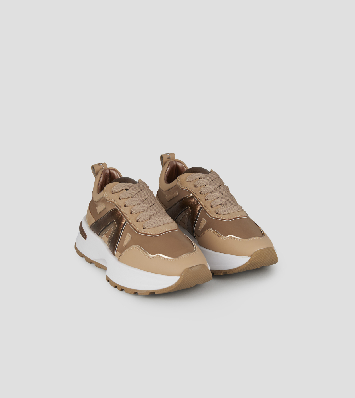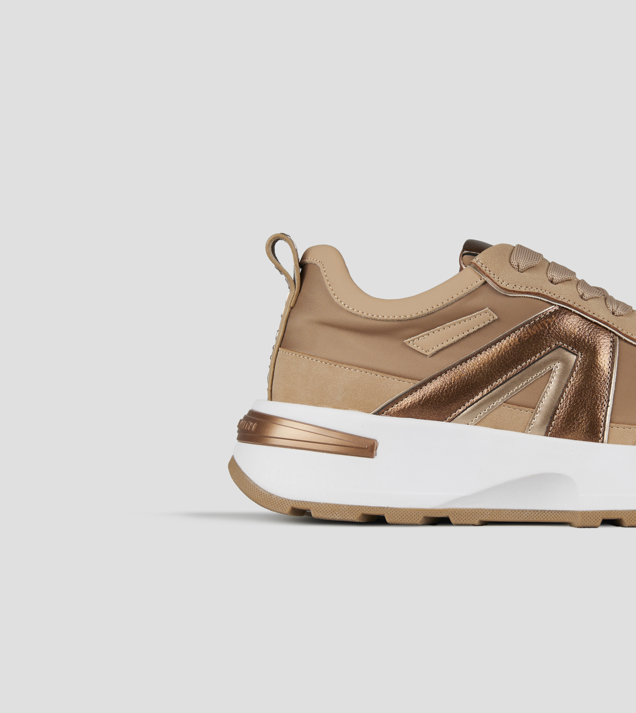 Precioso sneaker de piel y raso con detalle color oro viejo. Interior de piel y suela de goma. Altura de 6cm
