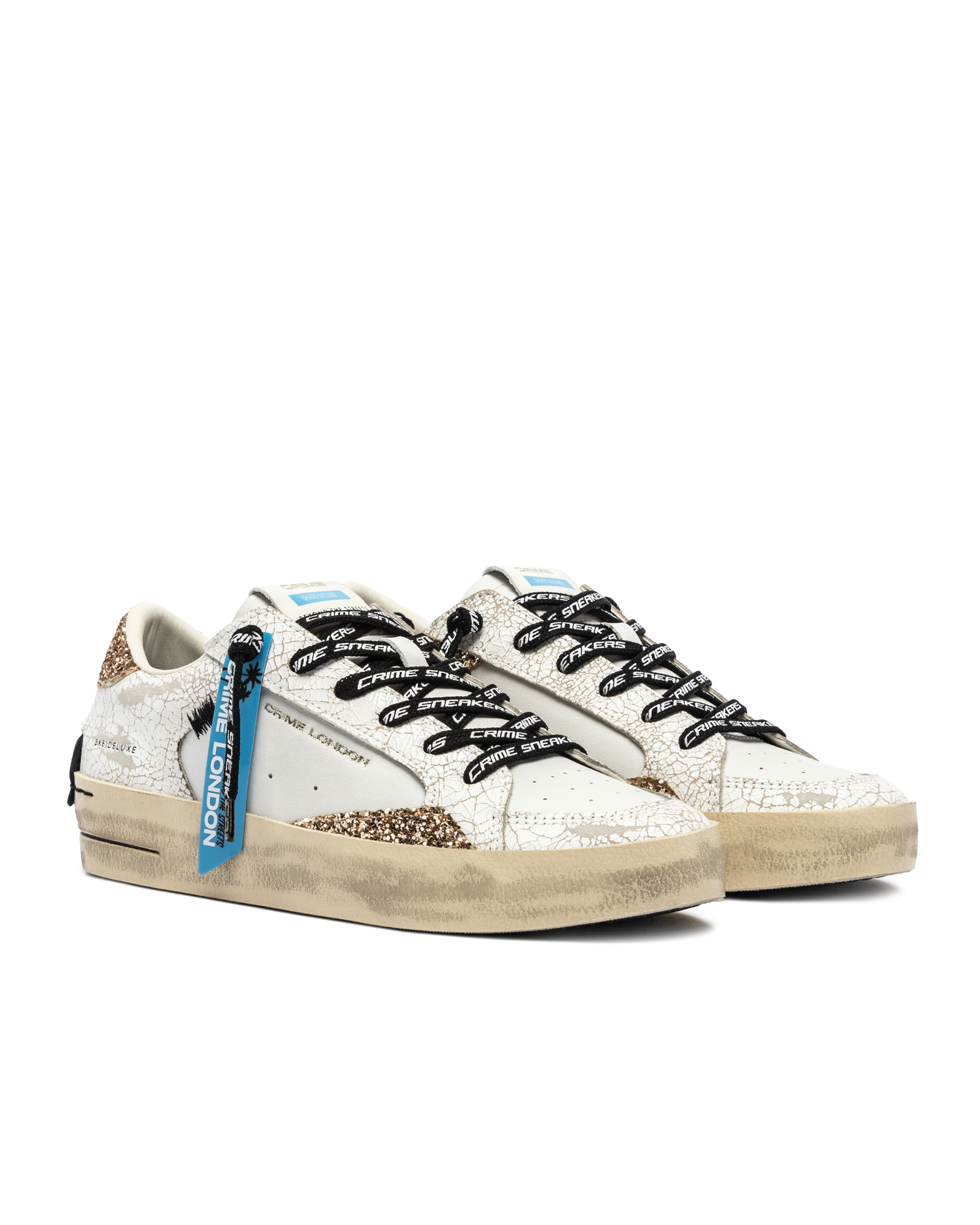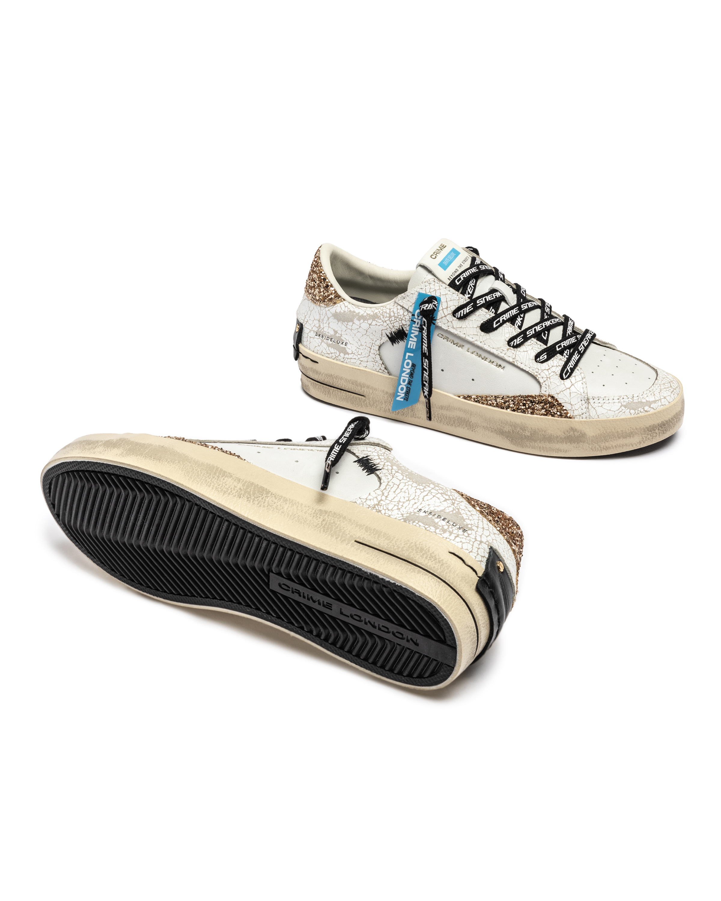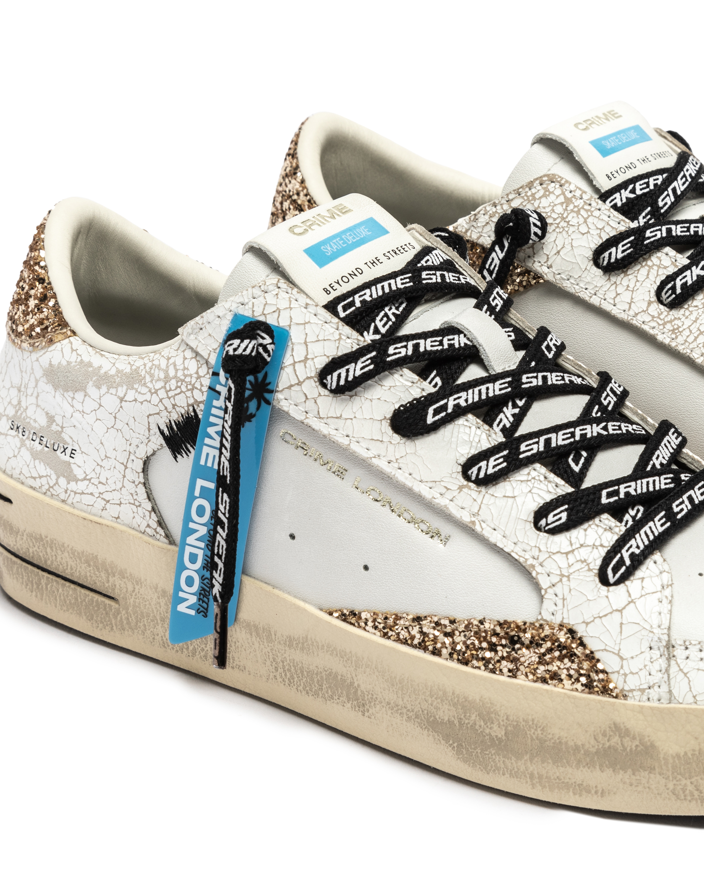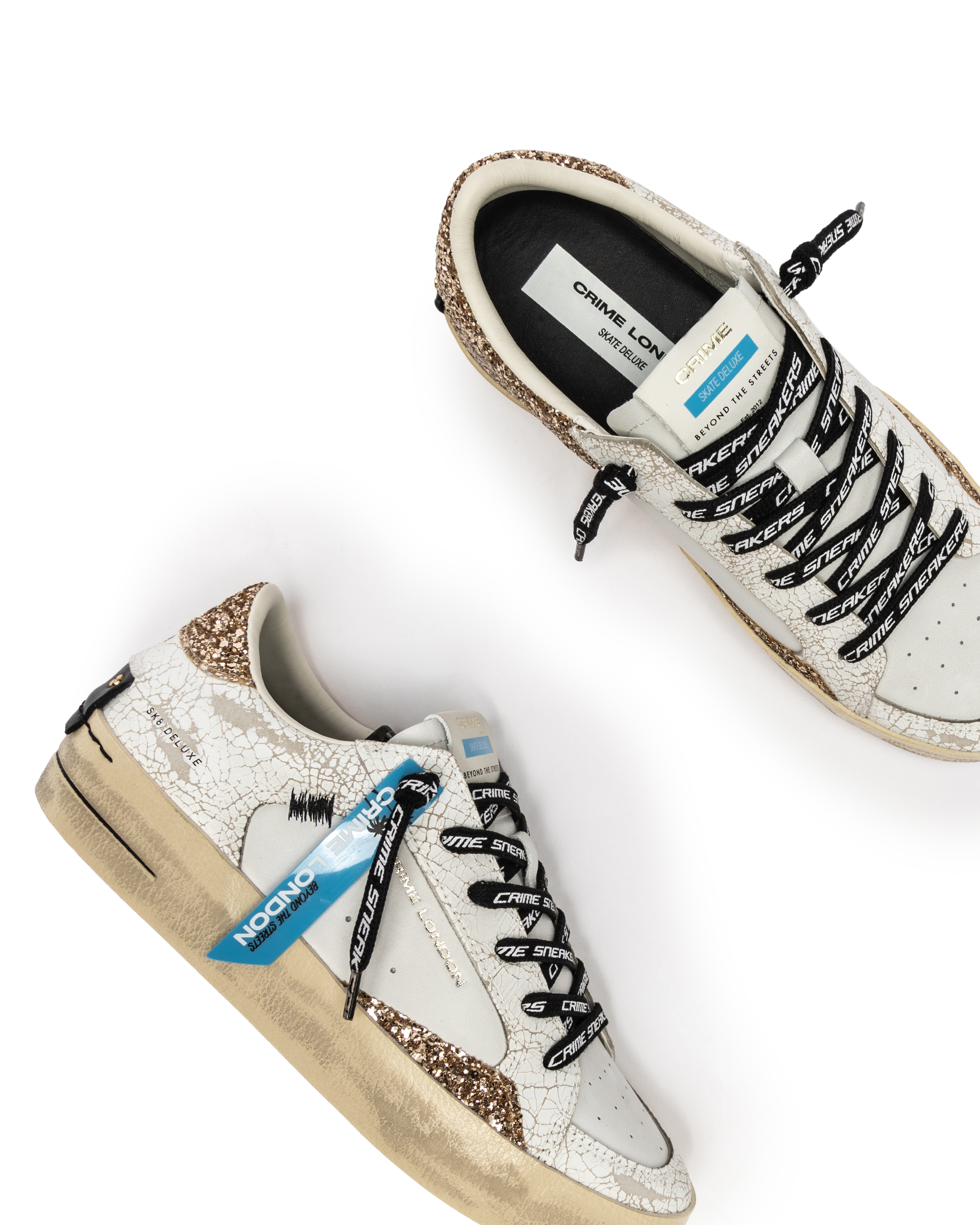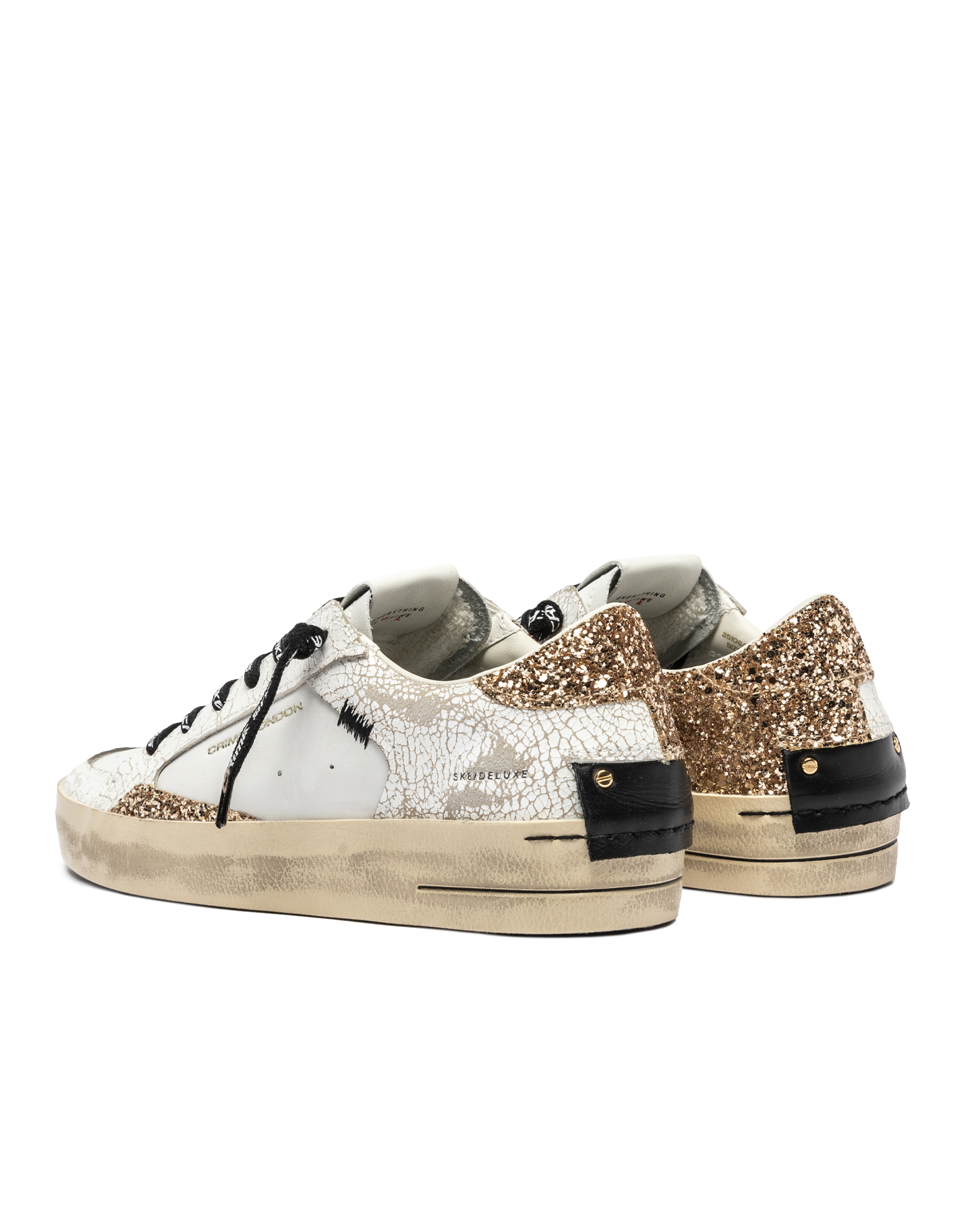 Sneaker estilo skate 100 % piel de becerro. Combina glitter y piel rota. Troquel en puntera. Cordones logotipados igual que lateral y lengüeta. Plantilla de piel de 2 cm. Forro de algodón. Suela goma.