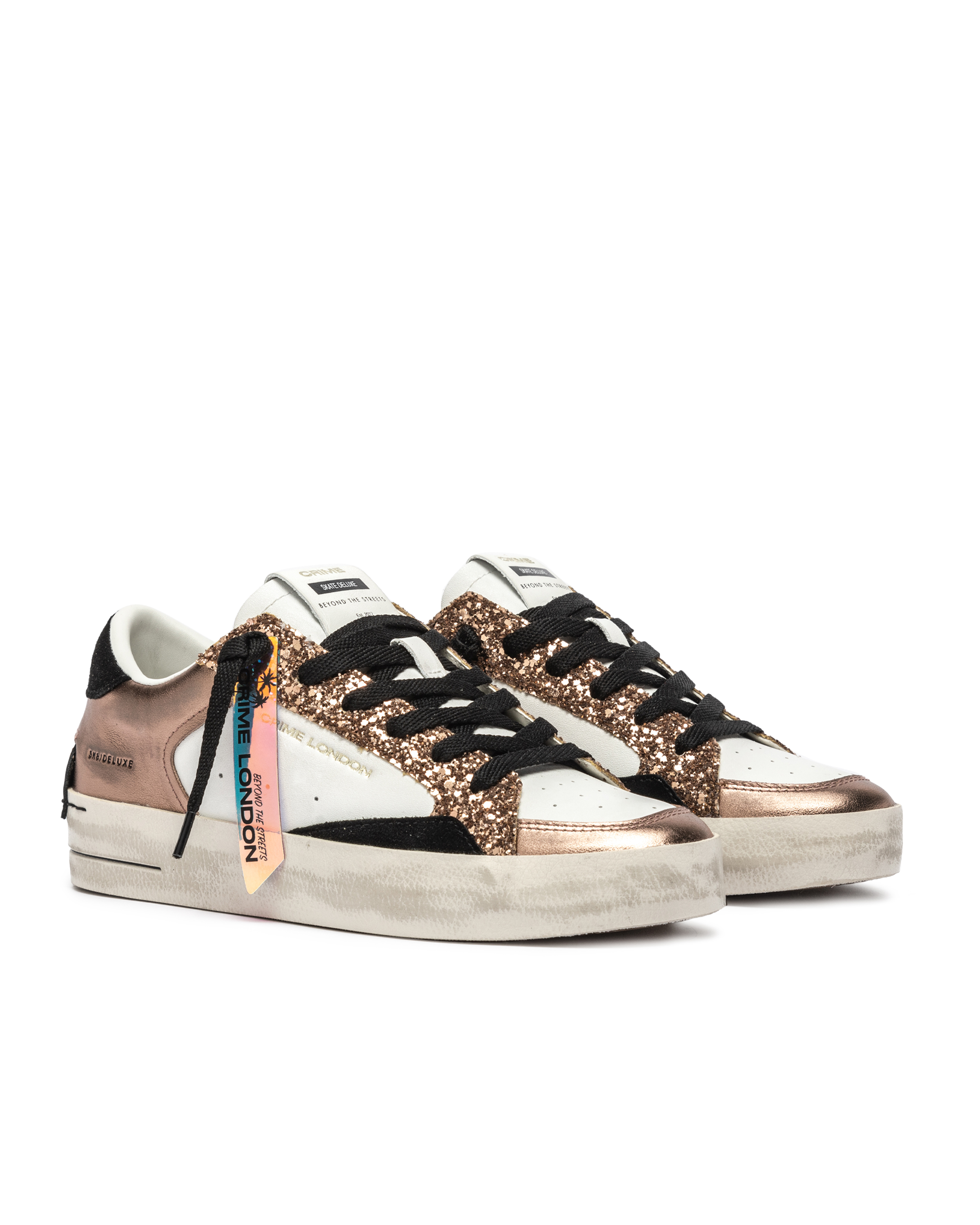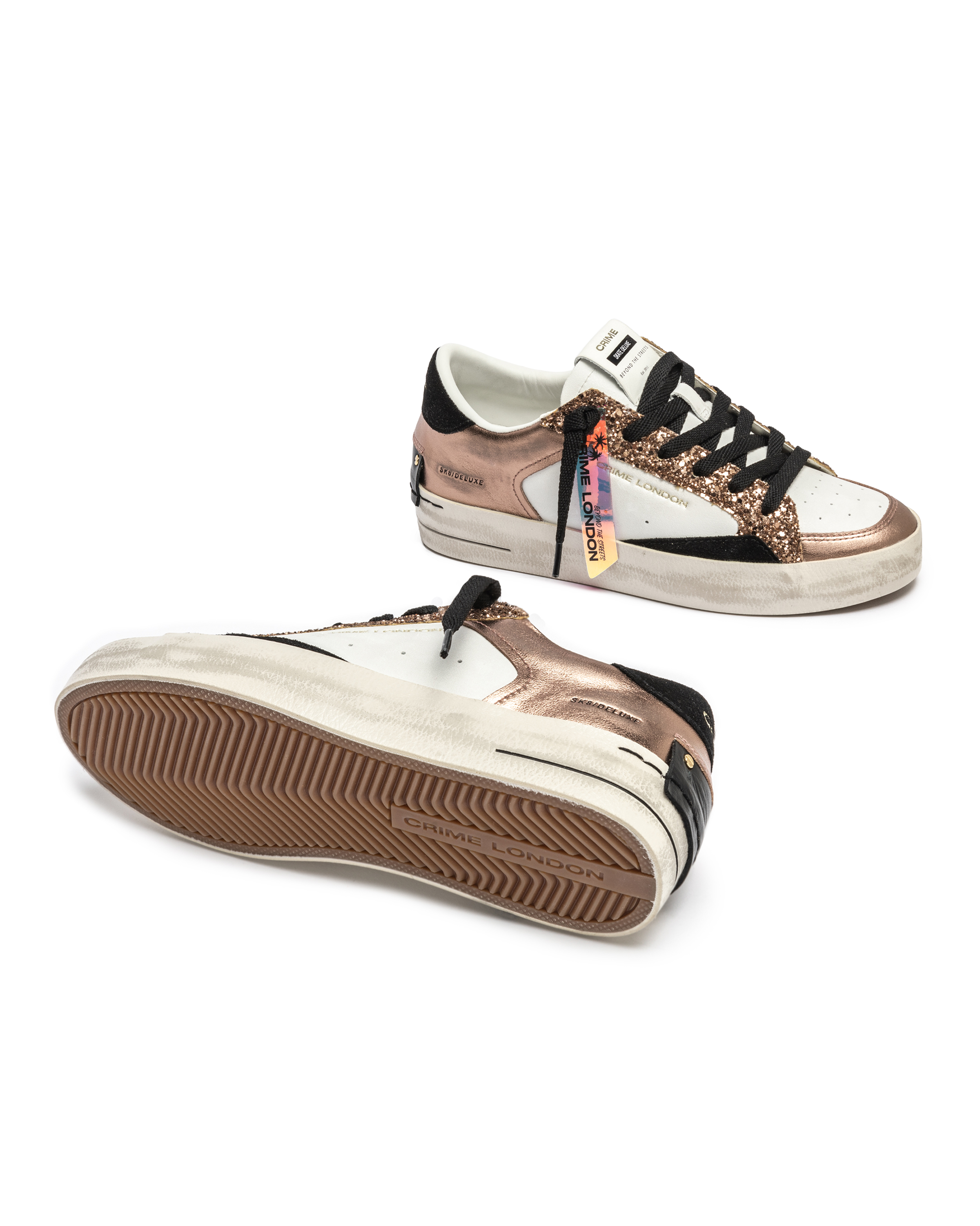 Sneaker estilo skate 100 % piel. Combina napa metalizada y glitter. Logo en lateral y talonera. Cordones a contraste. Plantilla de piel de 2 cm. Forro de rizo americano de algodón. Suela de goma.