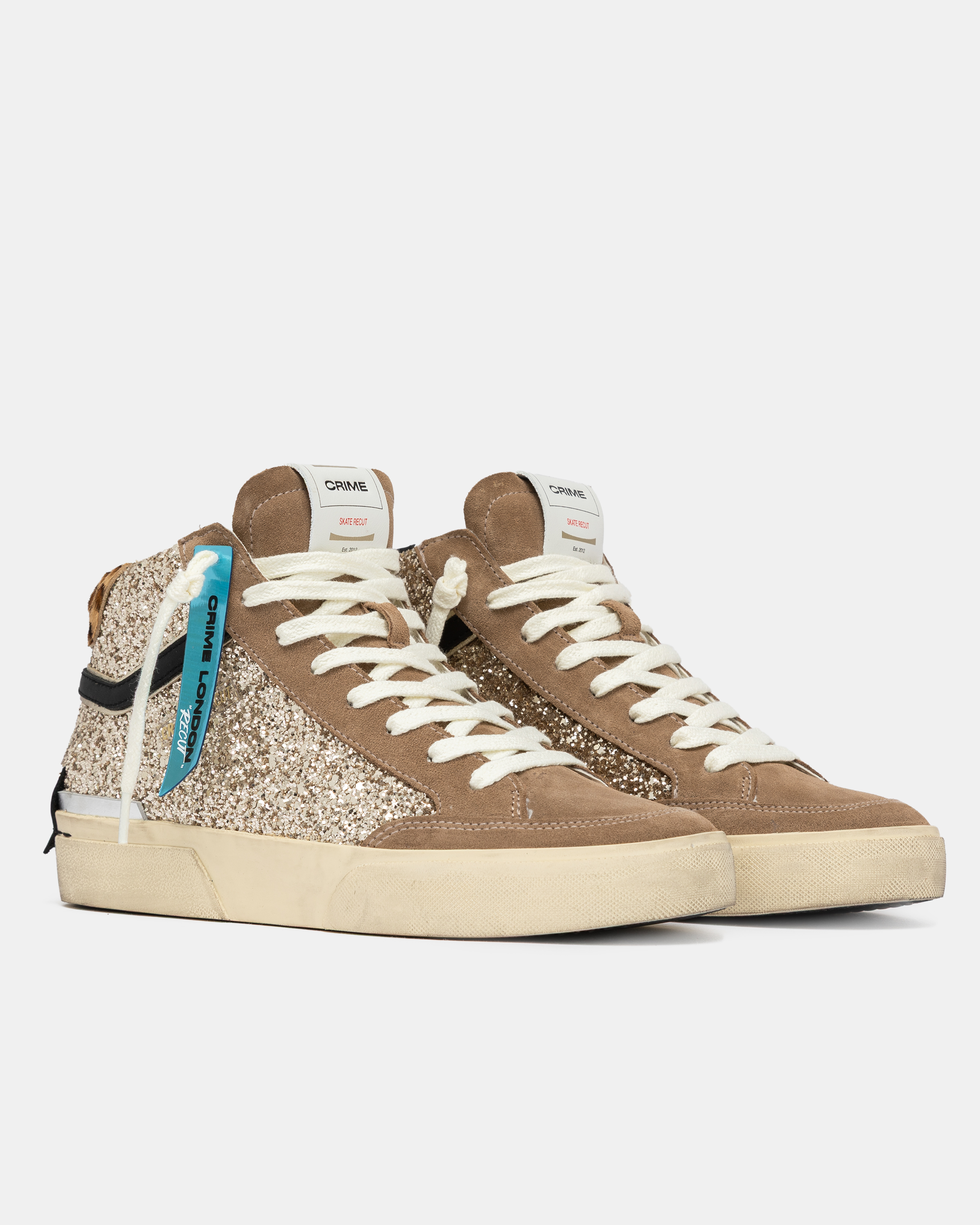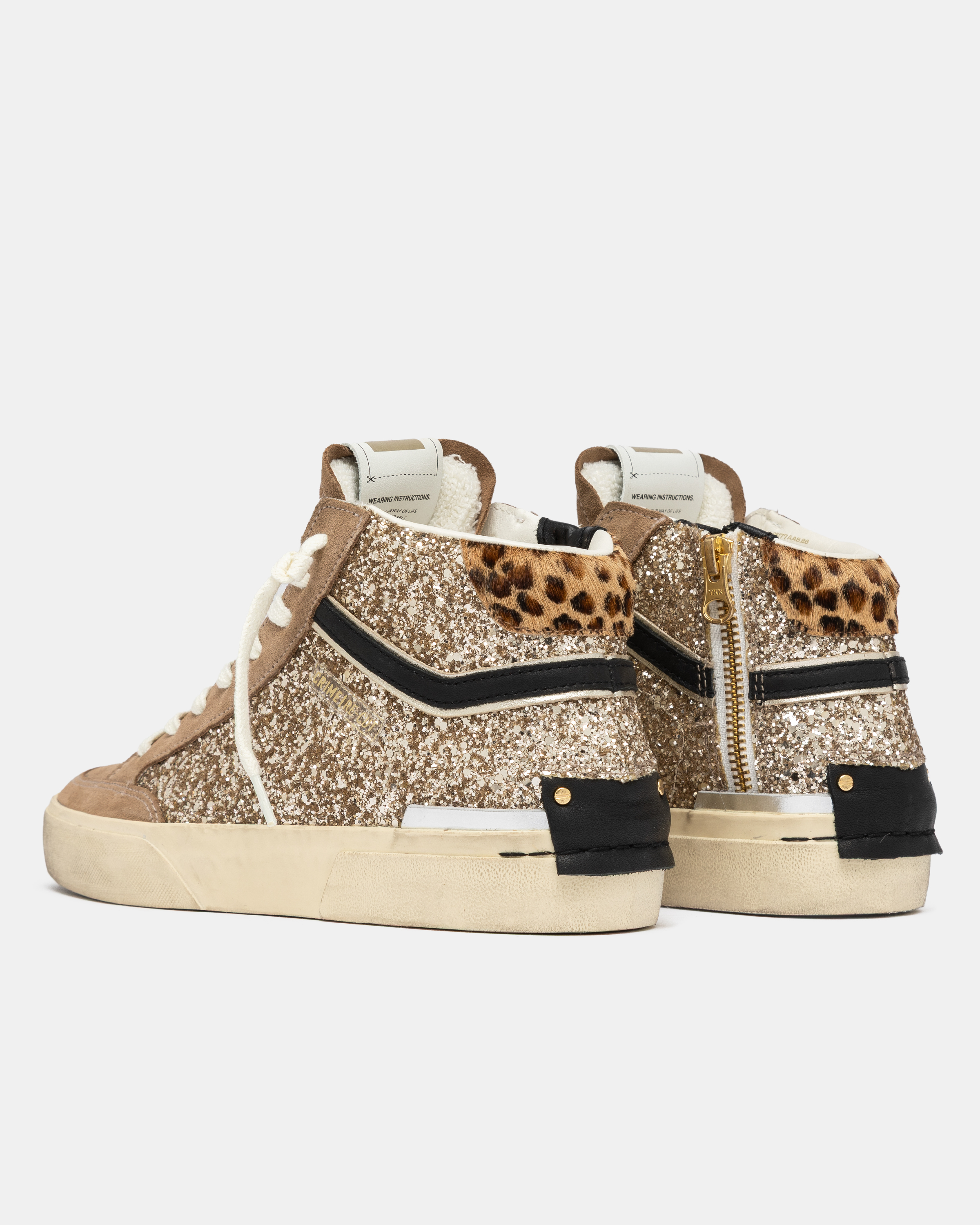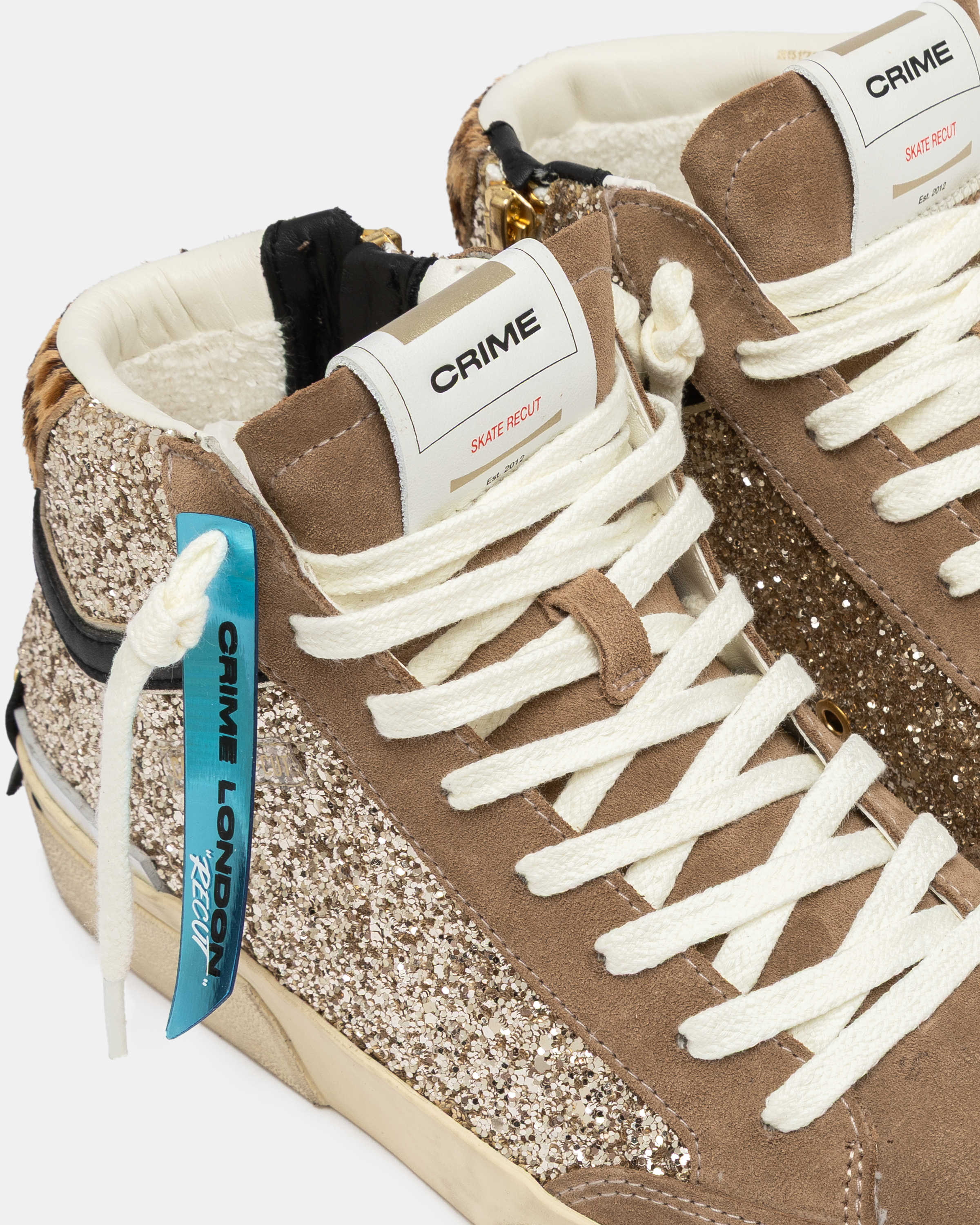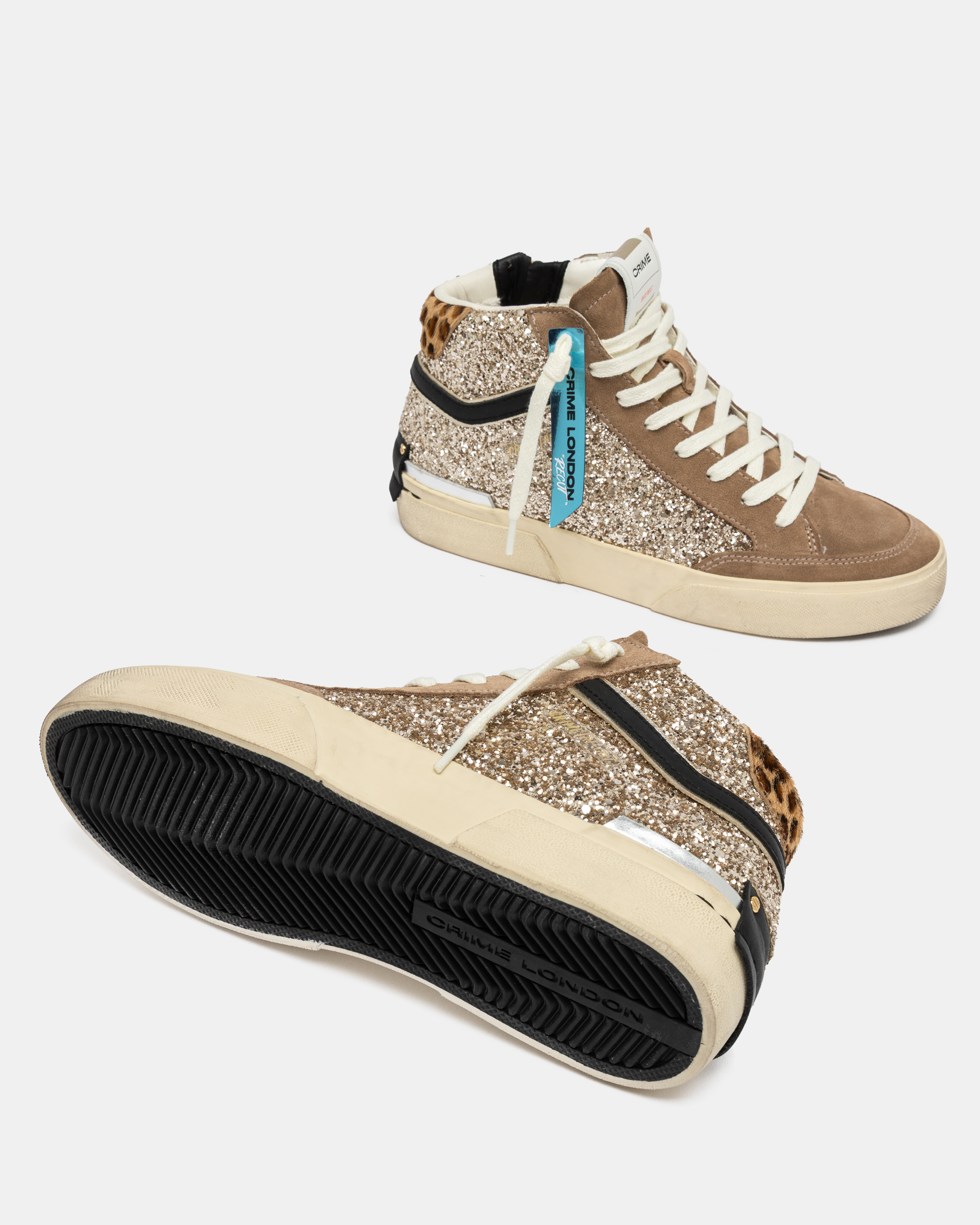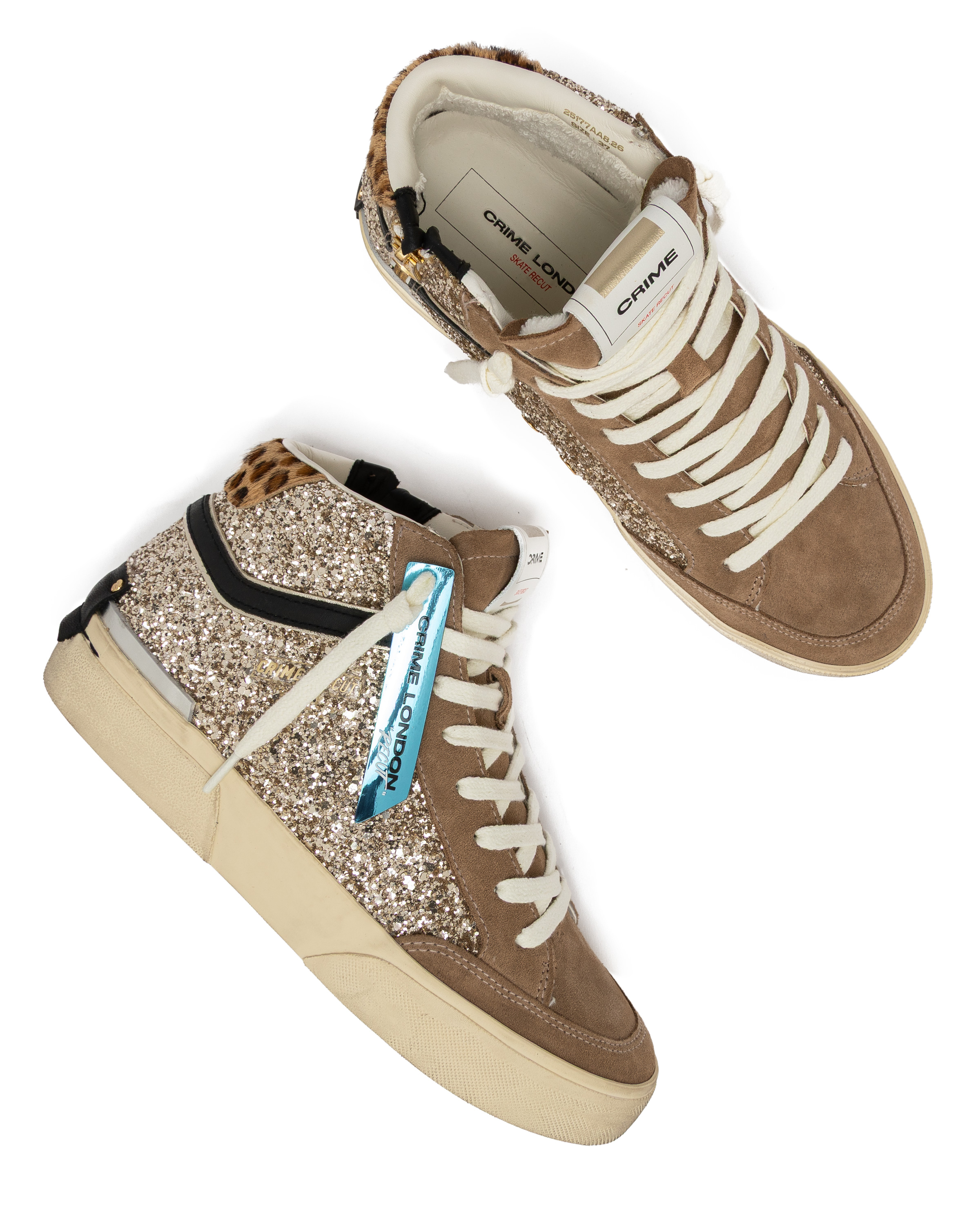 Sofistico botín deportivo de ante 100 % piel. Combina glitter y piel estampada animal. Cierre mediante cordones y cremallera lateral. Plantilla de piel y forro 100 % algodón.