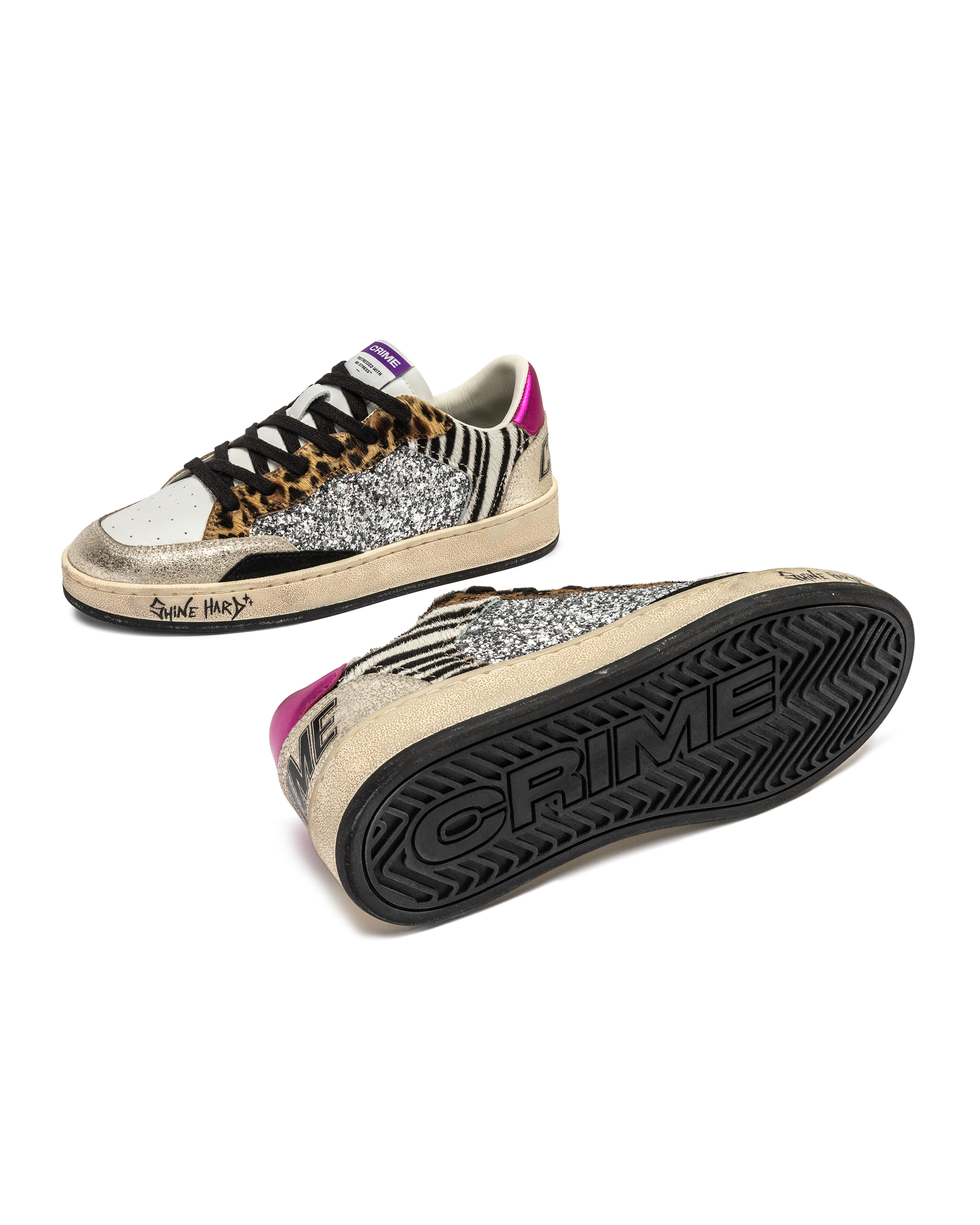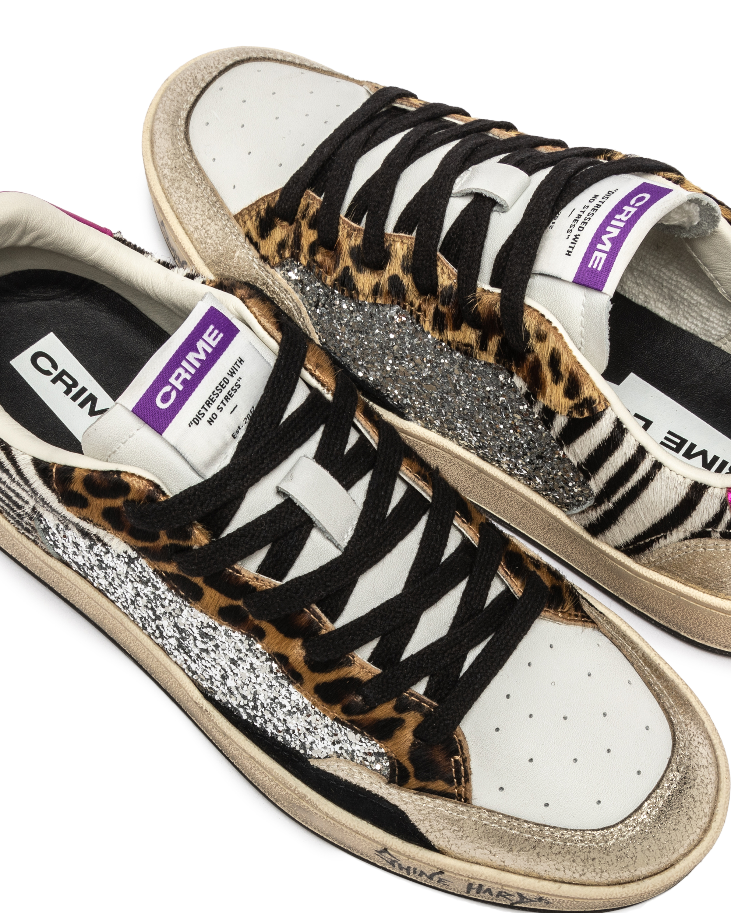 Sofisticada deportiva estilo skate 100 % piel. Combina detalles de glitter y piel de potro con distintos estampados animal. Cierre mediante cordones. Plantilla de piel. Forro de rizo 100 % algodón