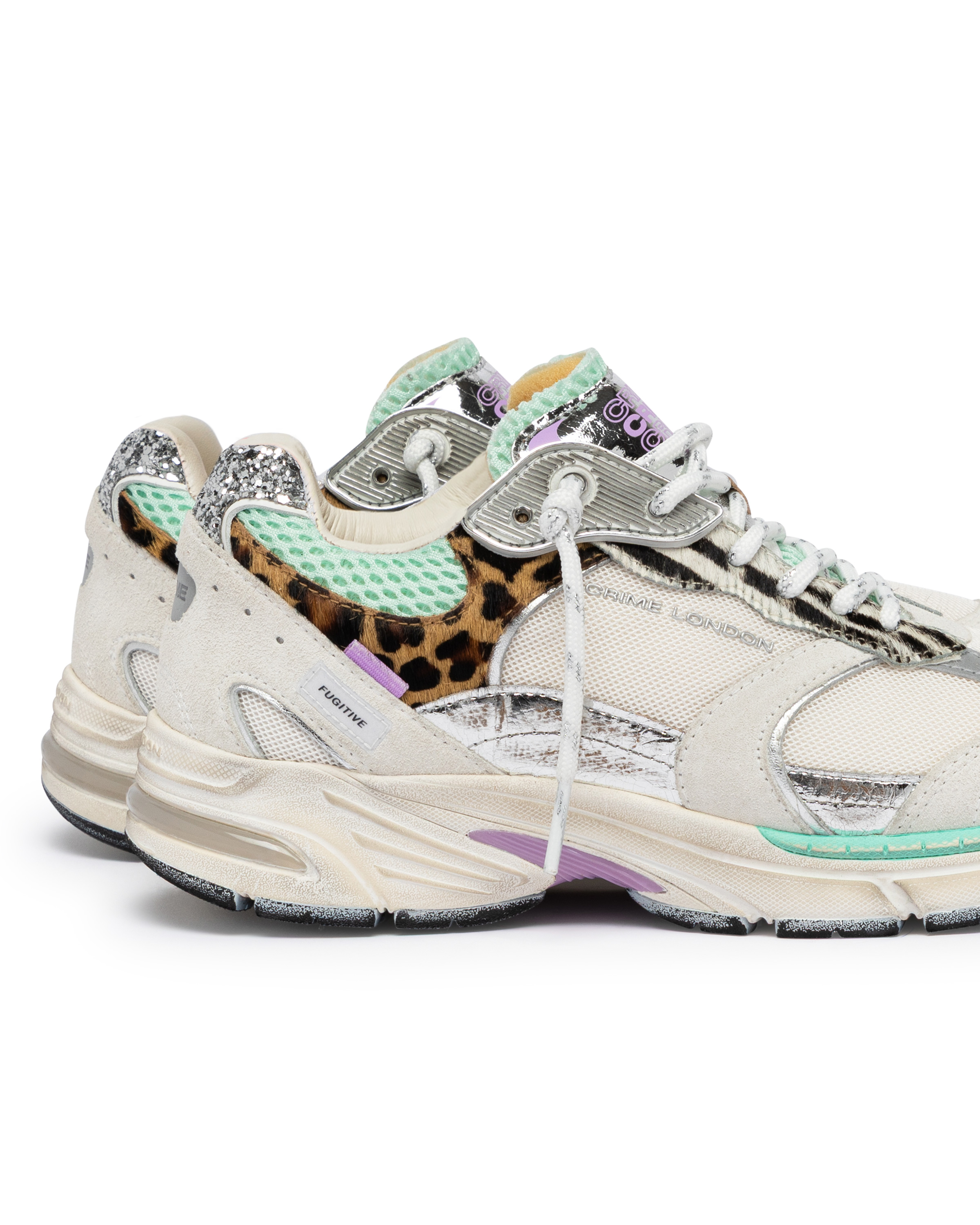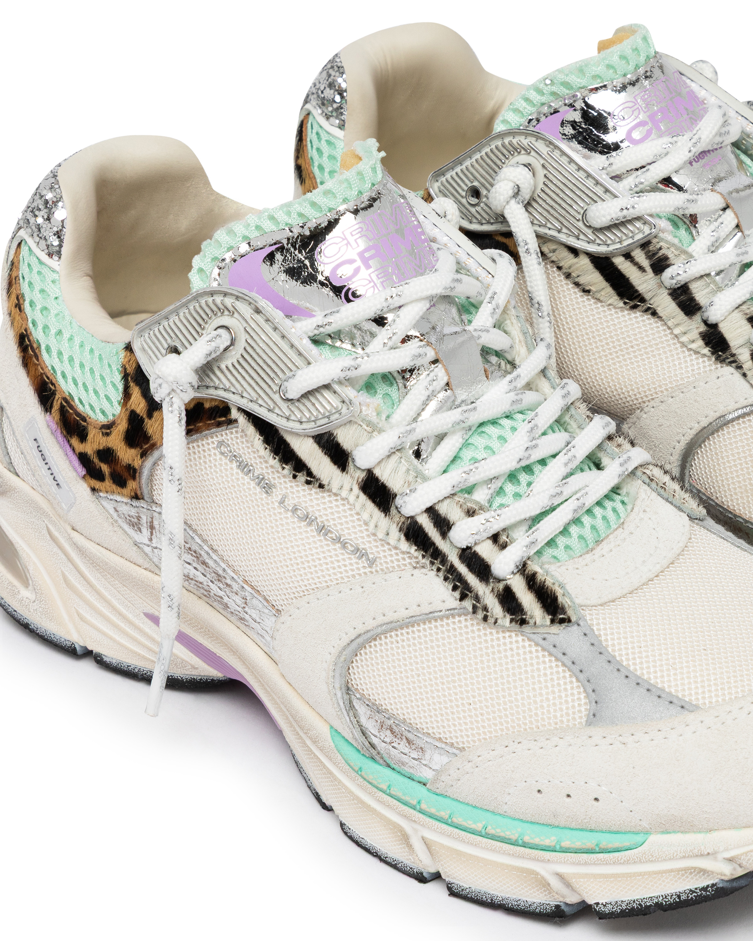 Zapatilla fabricada con materiales premium Made in Italy. De tejido y ante 100 % piel. Detalles becerro estampado. Forro algodón. Plantilla de piel. Suela de goma. Altura de 4 a 2'5 cm.