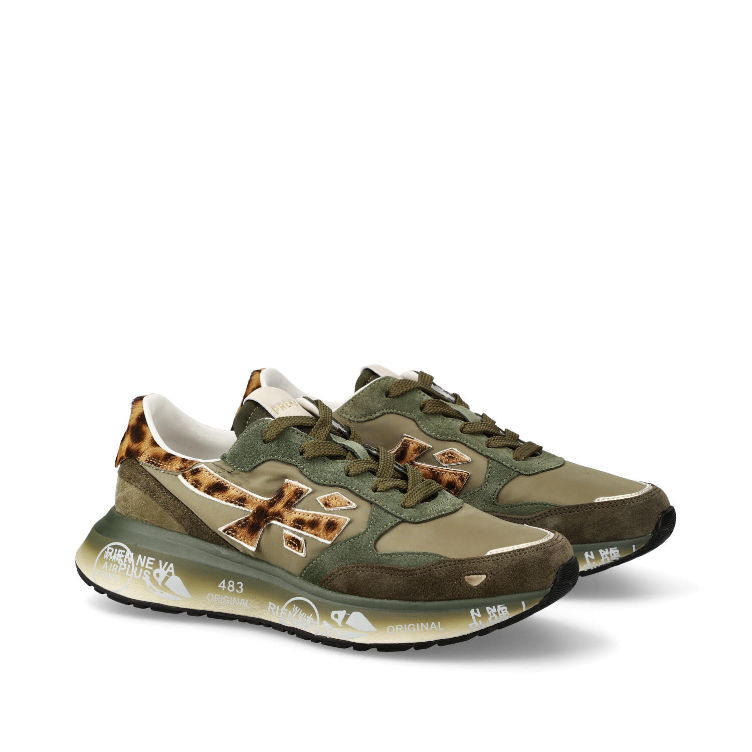 Nuevo modelo de deportiva que combina piel y téxtil en su exterior. Detalle de talonera y logo lateral en estampado animal. Plantilla y forro en suave piel caprina. Suela de goma.