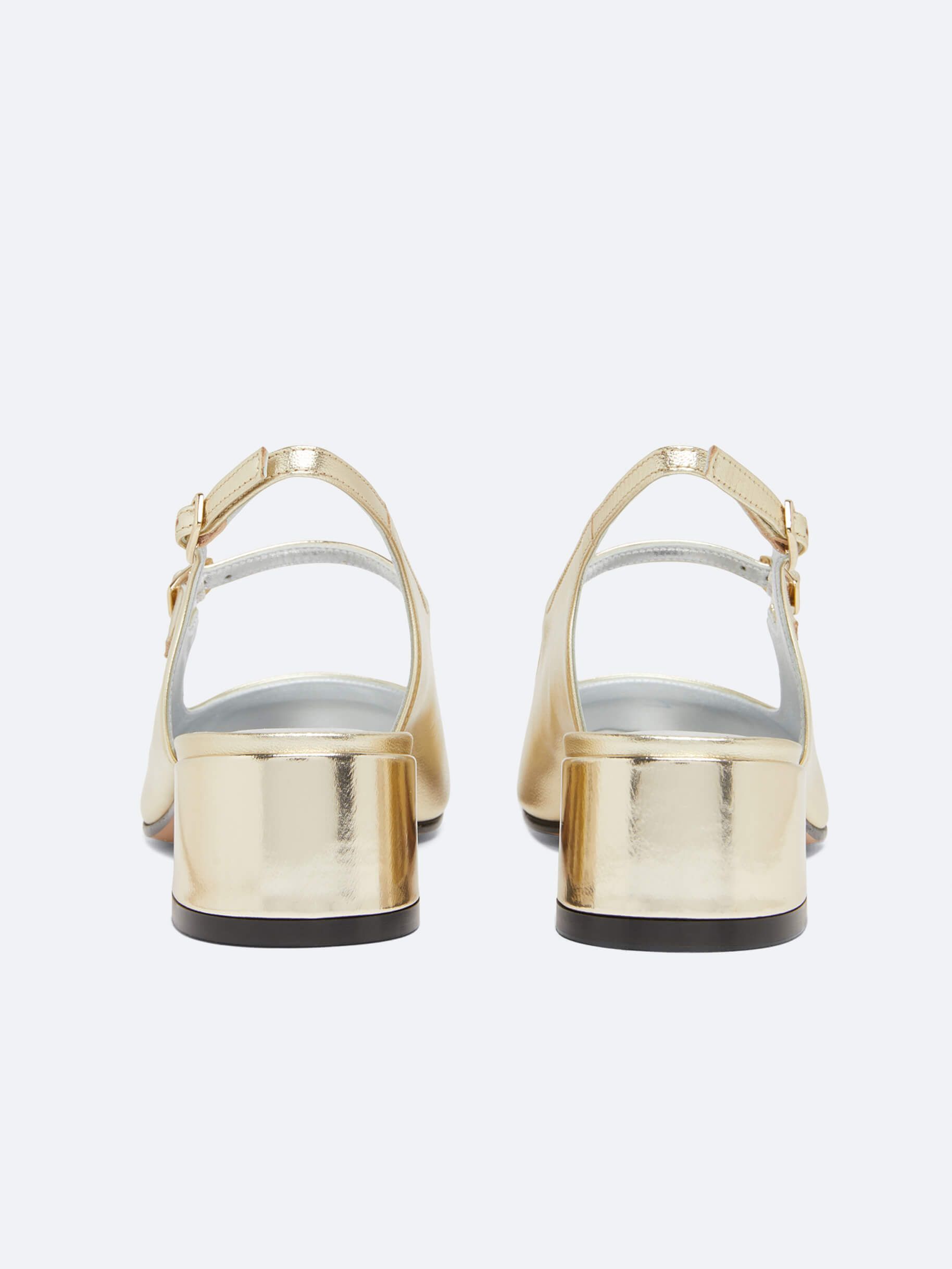 Elegante salón abierto estilo bailarina. Con tira trasera y en empeine con hebilla. 100 % piel. Suela de cuero. Forro y plantilla de piel. Tacón forrado de piel de 4 cm. Hecho a mano en Italia.
