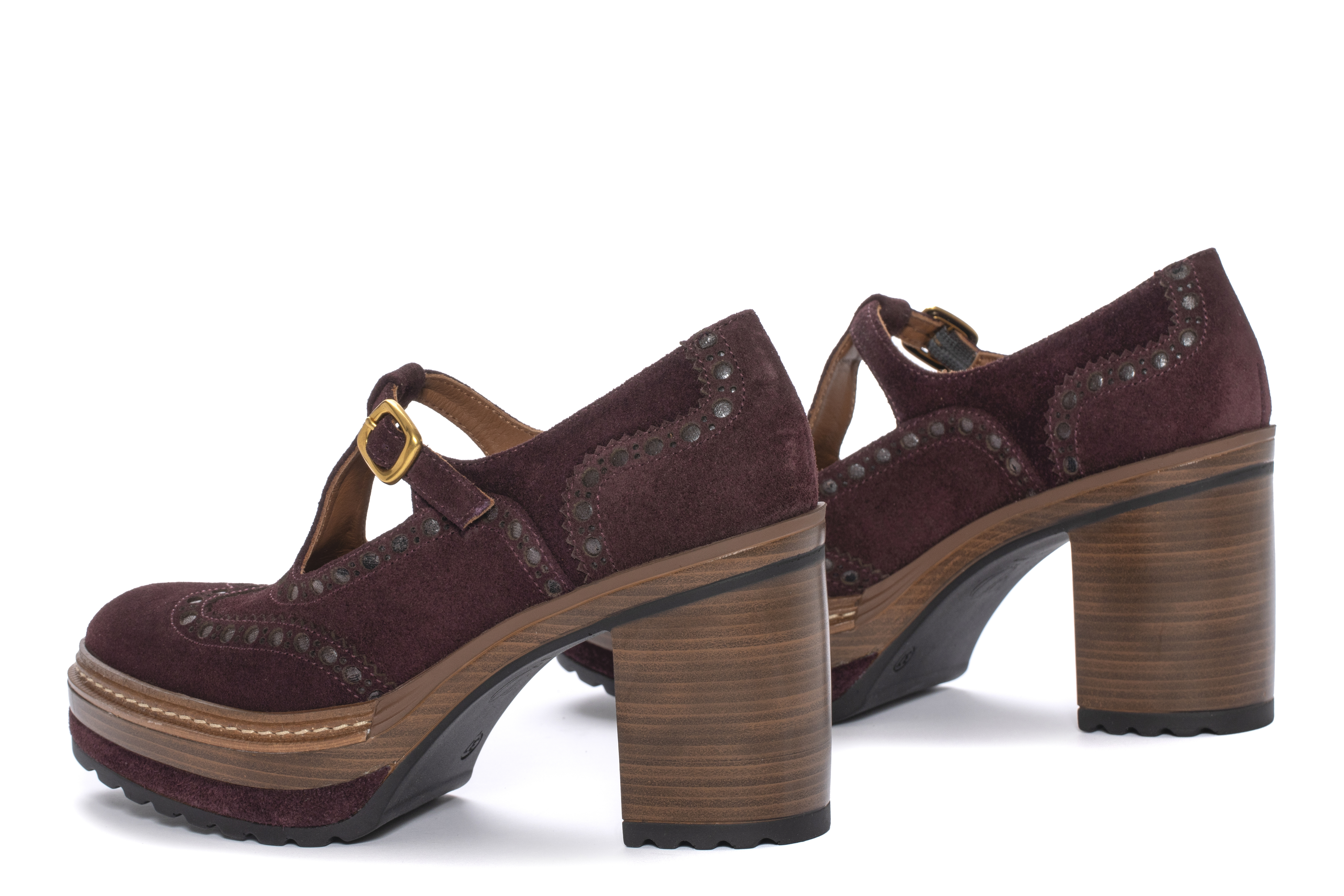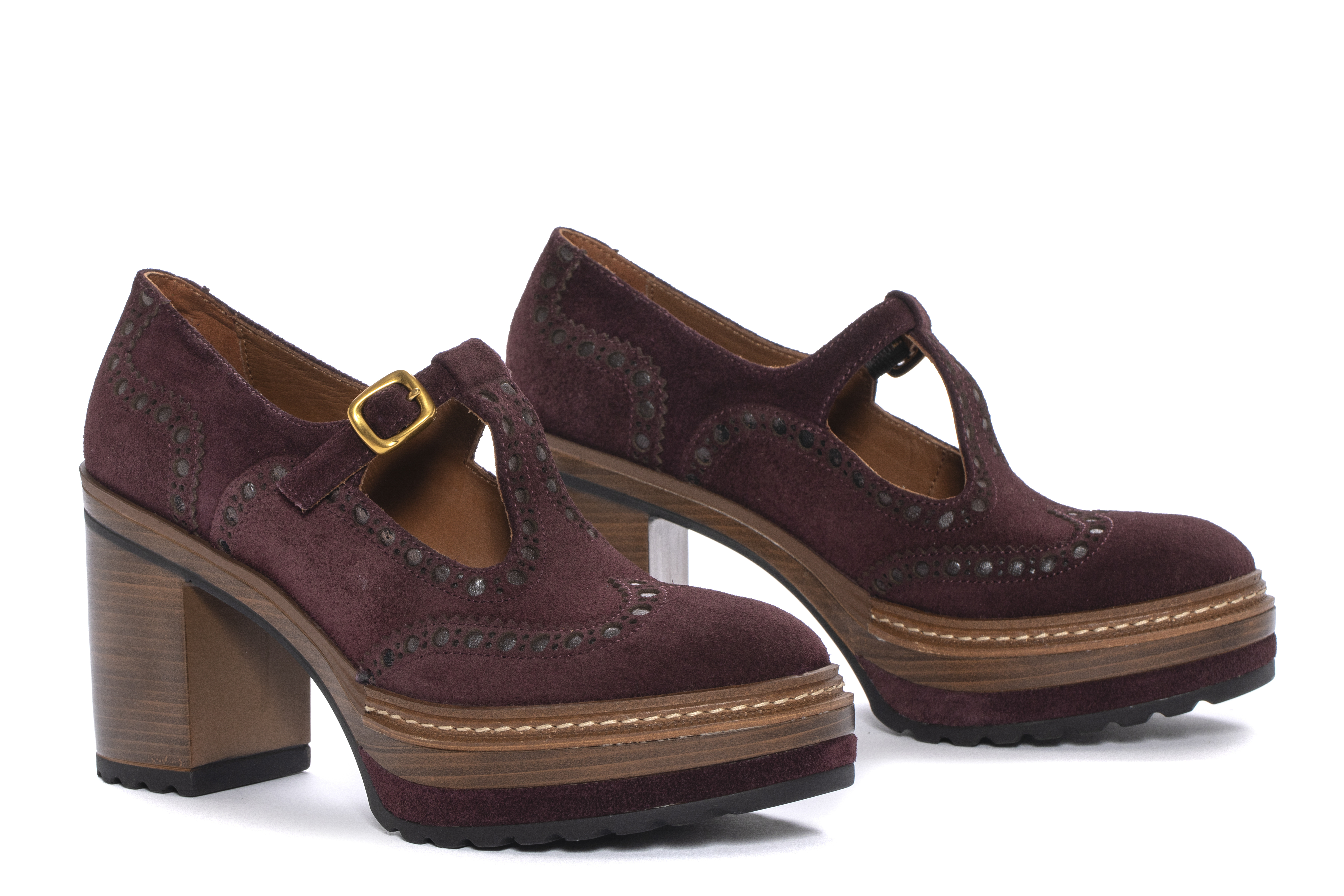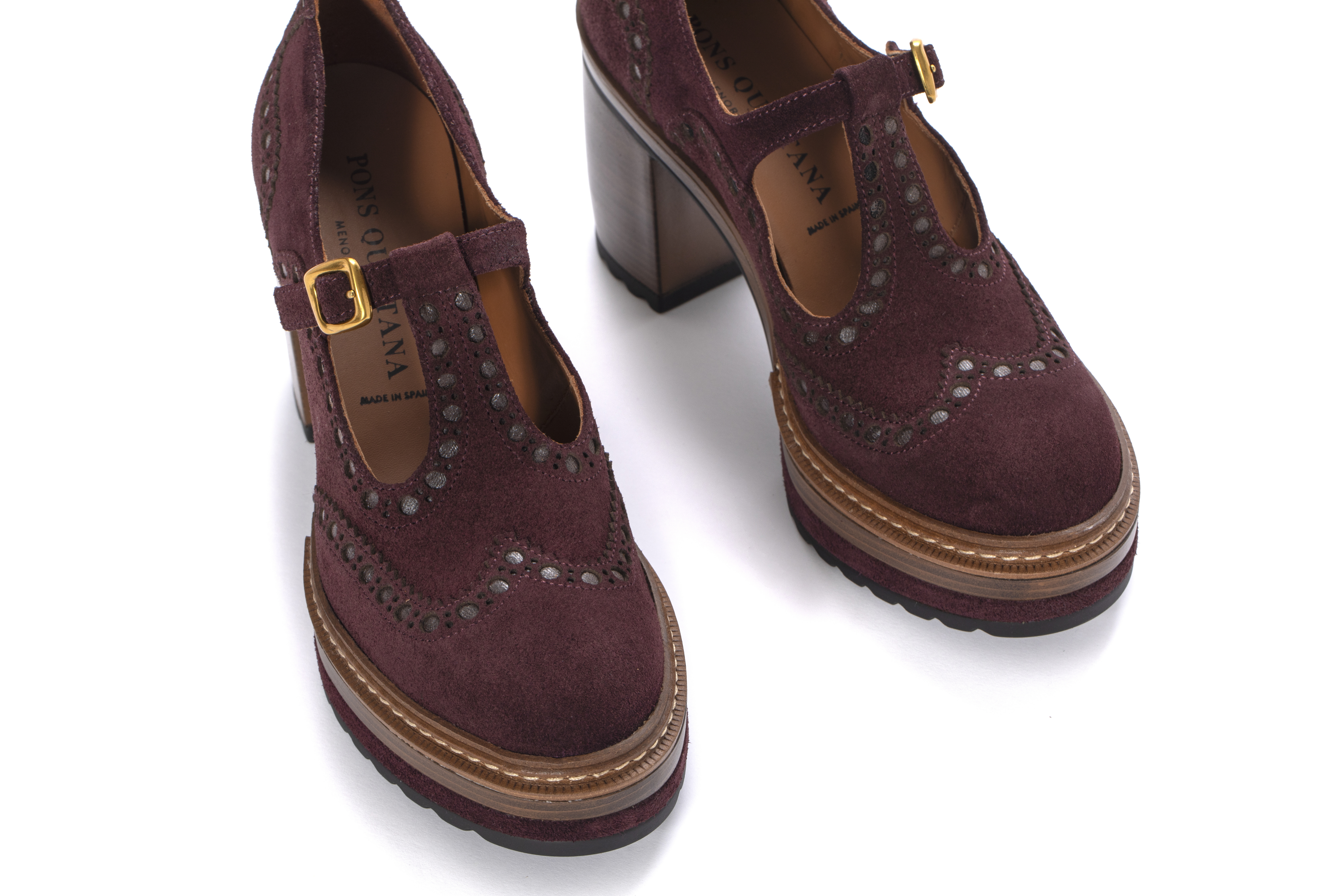 Moderna Mary Jane de ante 100 % piel ovina. Cierre mediante hebilla. Plantilla y forro de piel. Tacón de 9 cm. Plataforma de ante y madera de 3'5 cm. Suela de goma . Hecho a mano en Menorca.