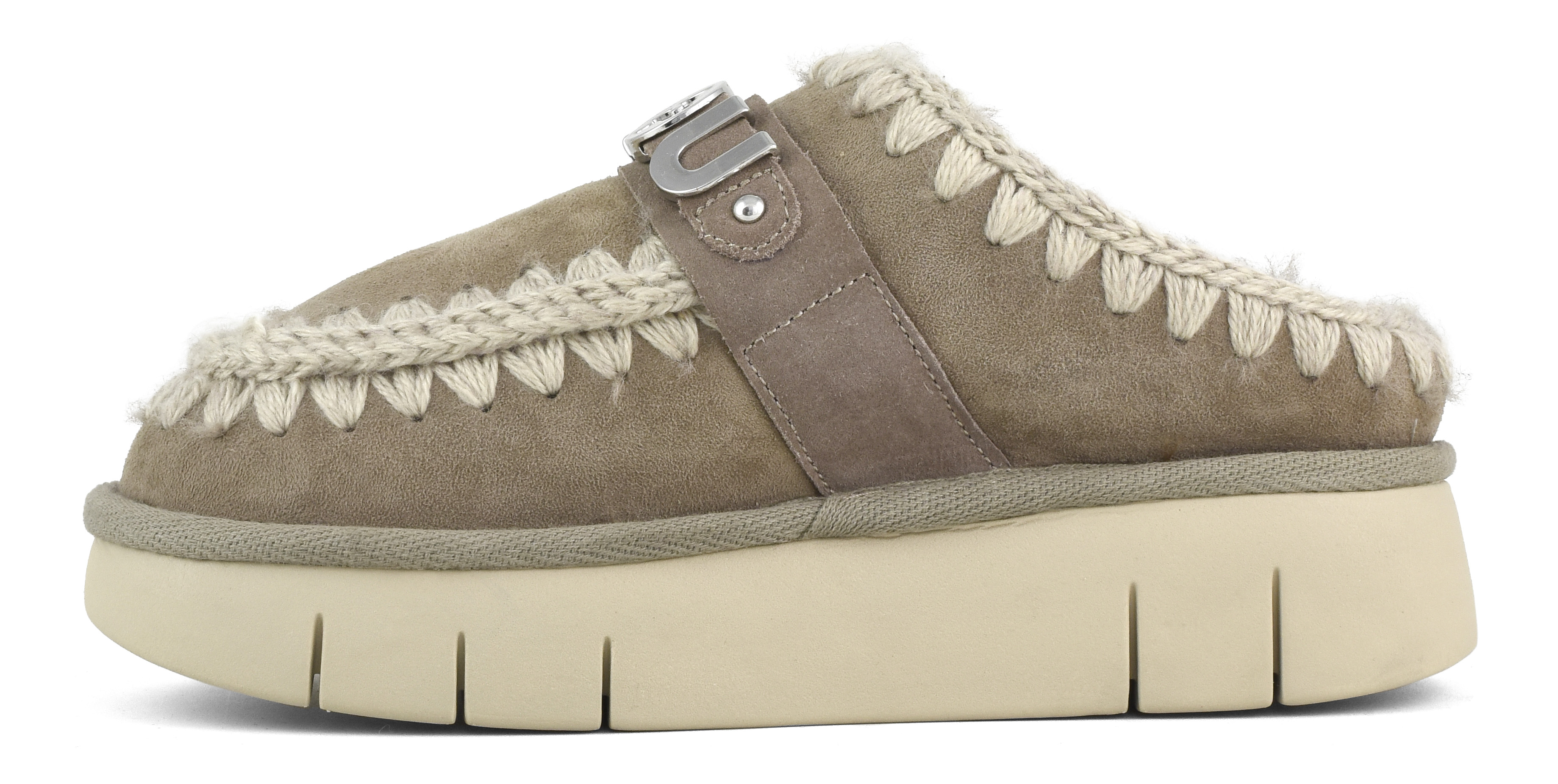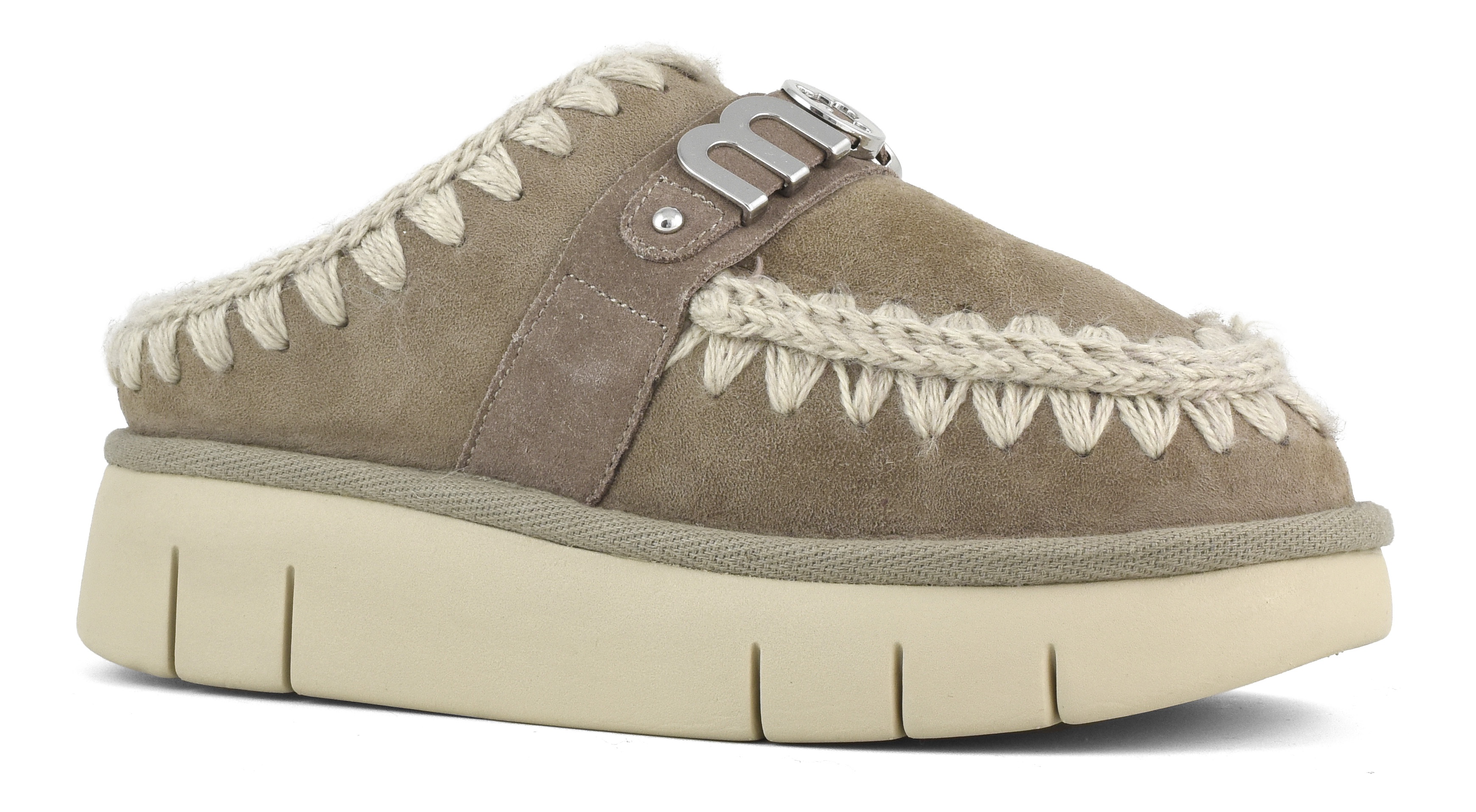 Divertido zueco estilo mocasín 100 % piel ovina. Detalle de pespunteado a mano mítico de la firma. Logo metálico en empeine. Plantilla y forro de piel. Suela de goma. Altura 4'5 cm.