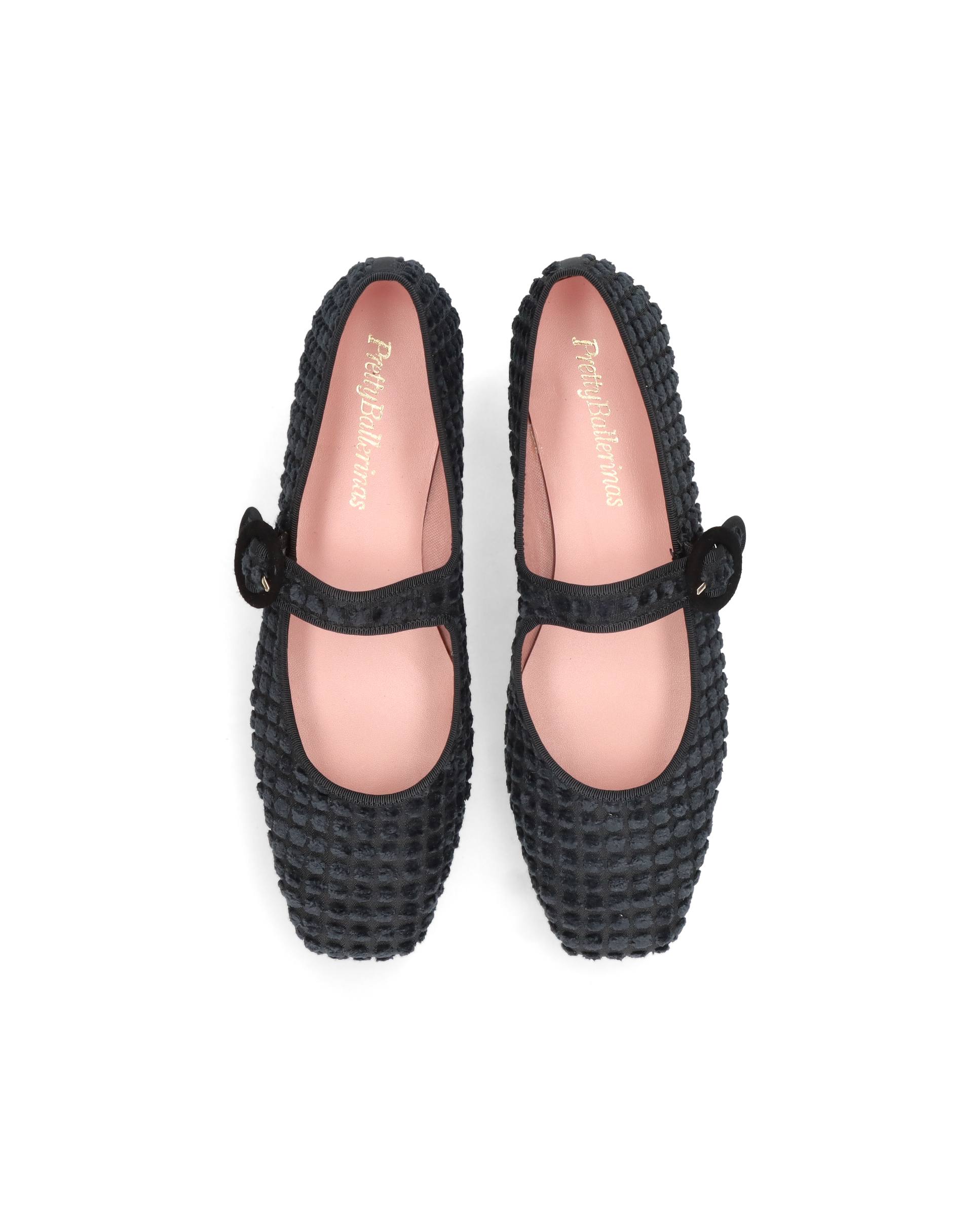 Elegante mercedita de terciopelo brocado. Cierre en empeine mediante hebilla forrada. Plantilla de piel y forro de tejido. Suela de goma.