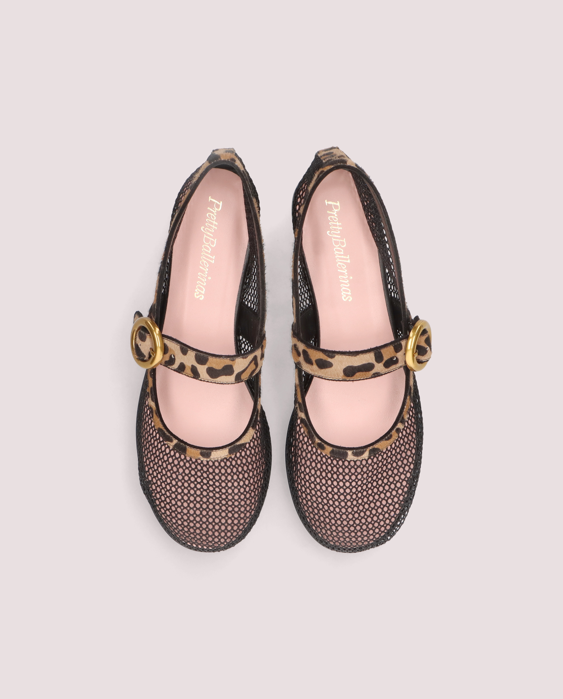 Mercedes de malla técnica. Ribete y correa realizados en cavallino 100 % piel, de estampado animal. Plantilla acolchada a contraste 100 % piel ovina. Suela de cuero.